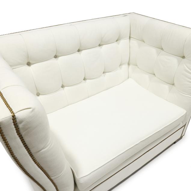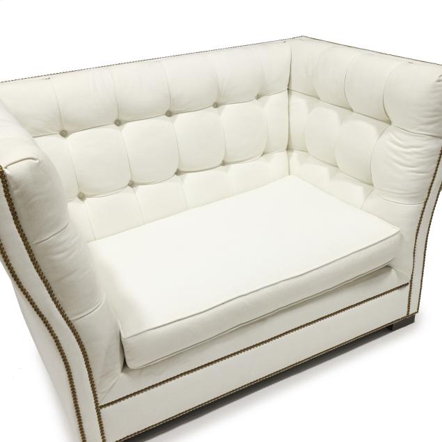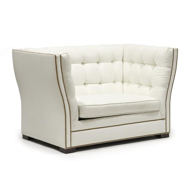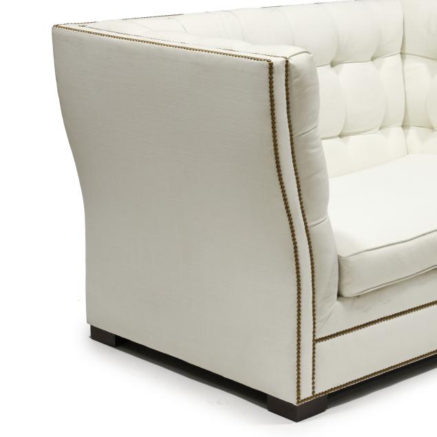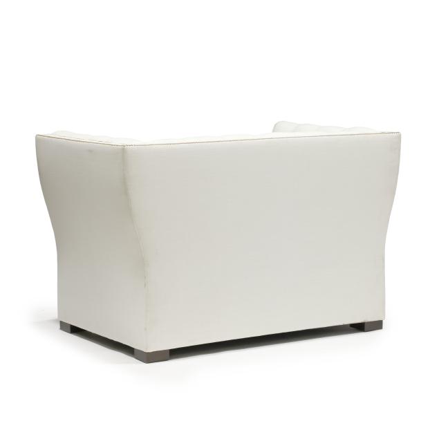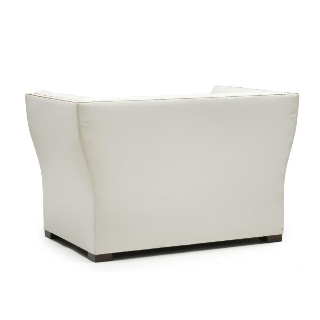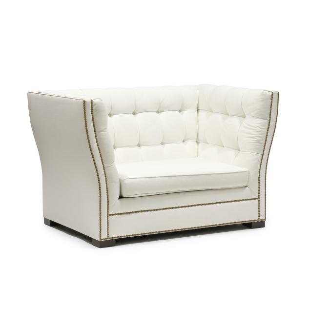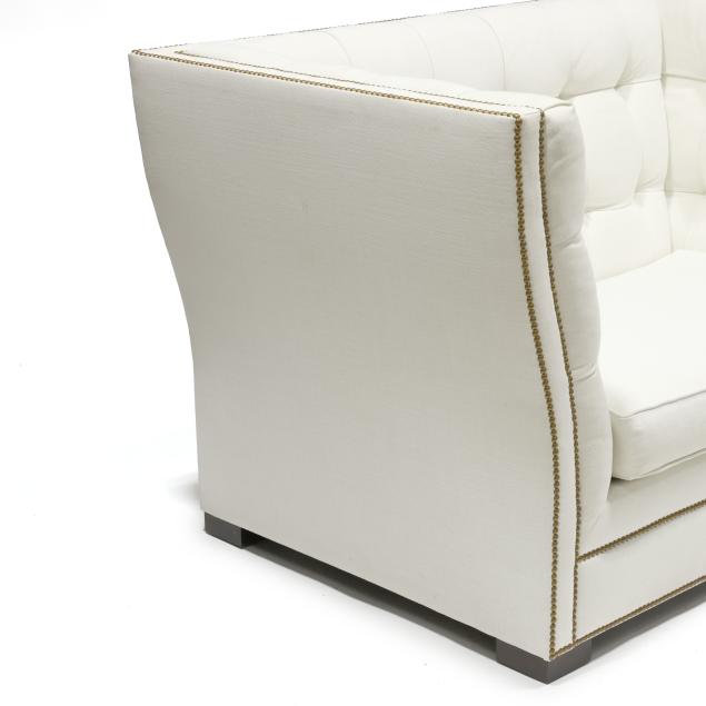 Attributed Hickory White, white upholstery with patinated brass tack trim, high back and flush arms with tufted panels, single loose seat cushion, short block mahogany feet, unmarked.