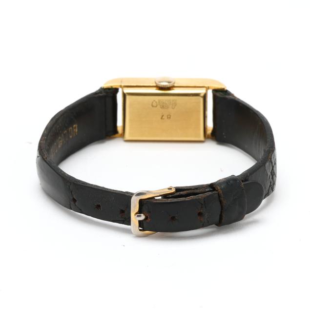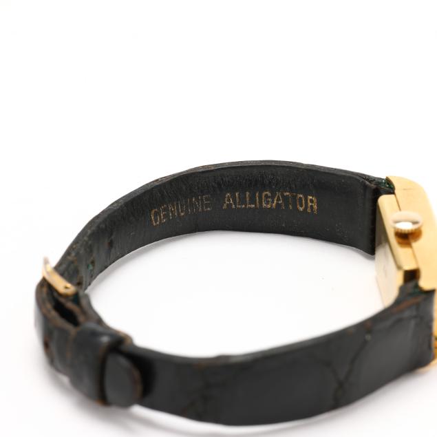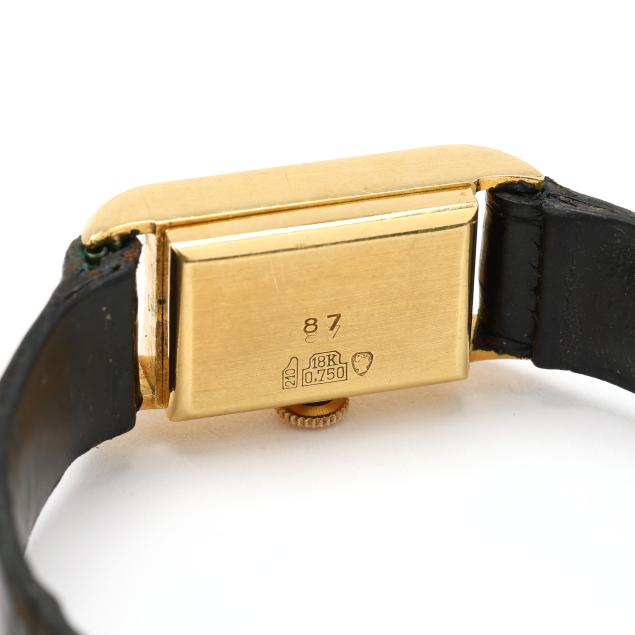 Manual wind, Aurore-Villeret 41, caseback number 87, the rectangular case with textured concave bezel and convex crystal, the signed white dial with gold bar hour markers and gold sword hands, the black leather strap marked Genuine Alligator completed with gold-tone buckle, the caseback with Swiss hallmarks for 18KT and numbered 87.