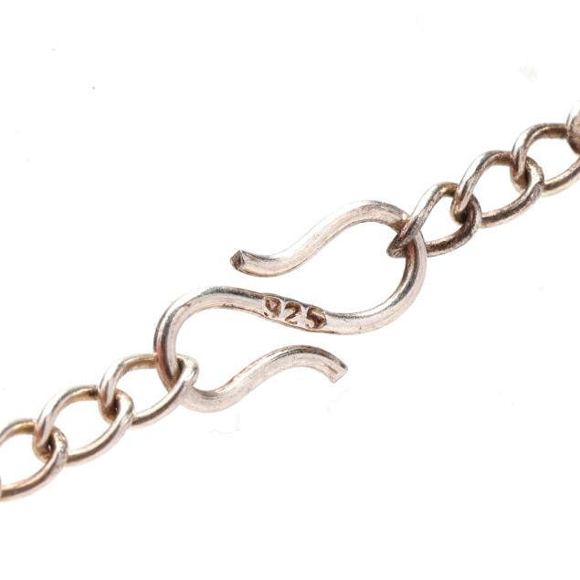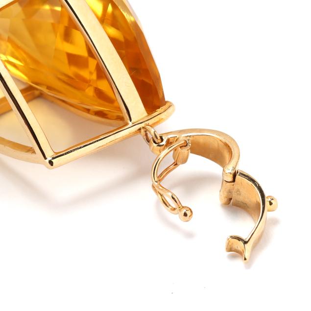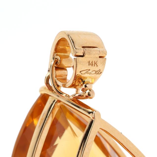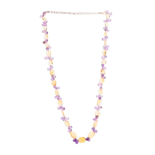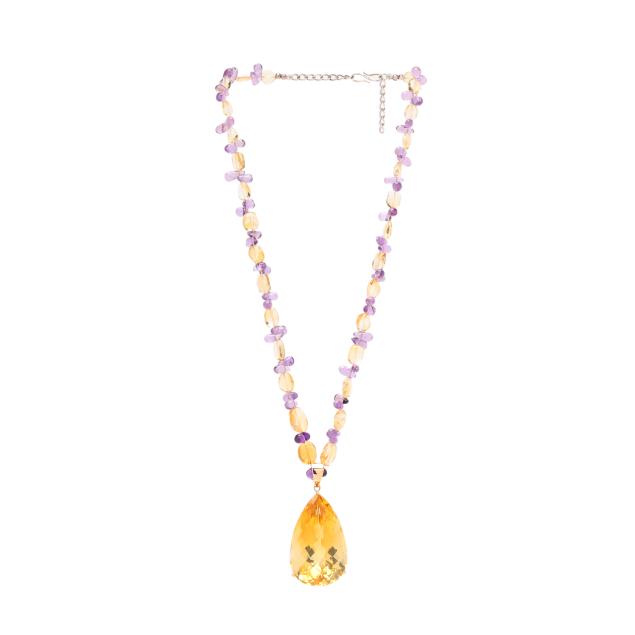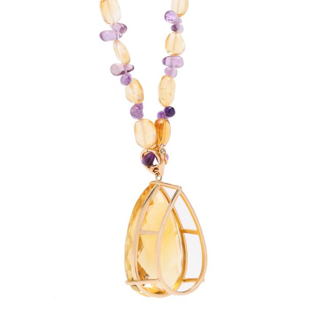 The pendant set with a pear cut citrine (40 x 25 x 19mm) weighing approximately 97 carats, completed with a hinged bail with figure eight safety, signed and stamped 14K, suspended from a necklace strung with alternating citrine and amethyst polished stones, completed with a hook clasp, stamped 925.