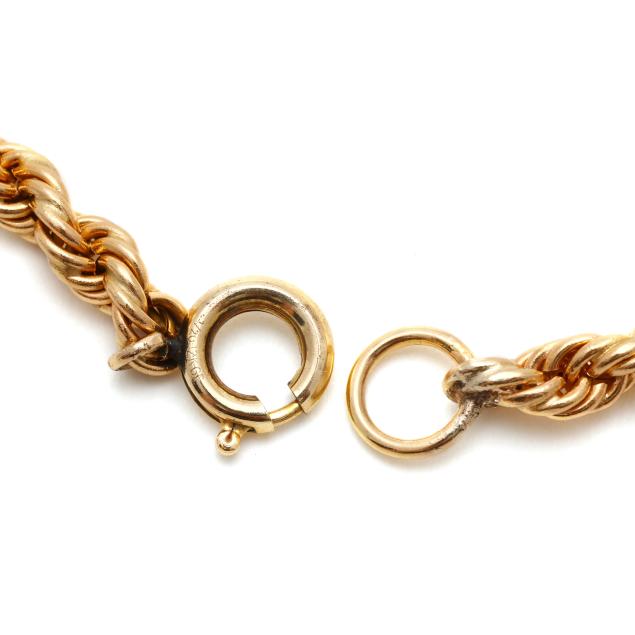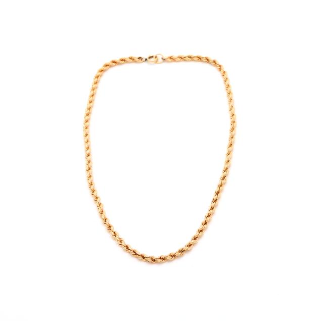 The rope chain necklace completed with spring ring clasp, clasp stamped 1/20 12K GF, chain acid testing 18KT.