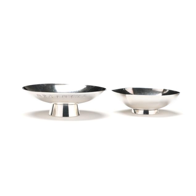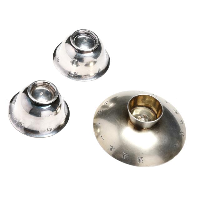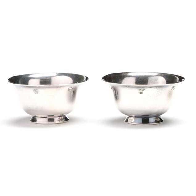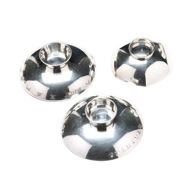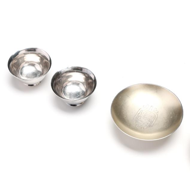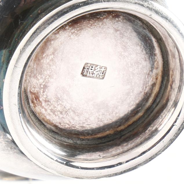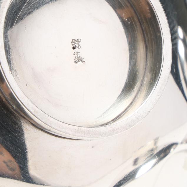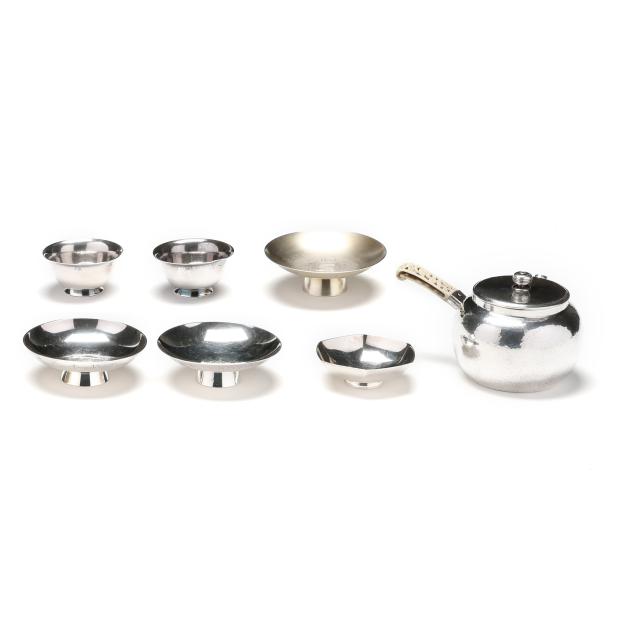 The teapot with relief carved handle and hammered exterior, with two-character mark to the underside of the lid; and (7) various footed bowls, all marked, some with character marks to the underside of the rims.