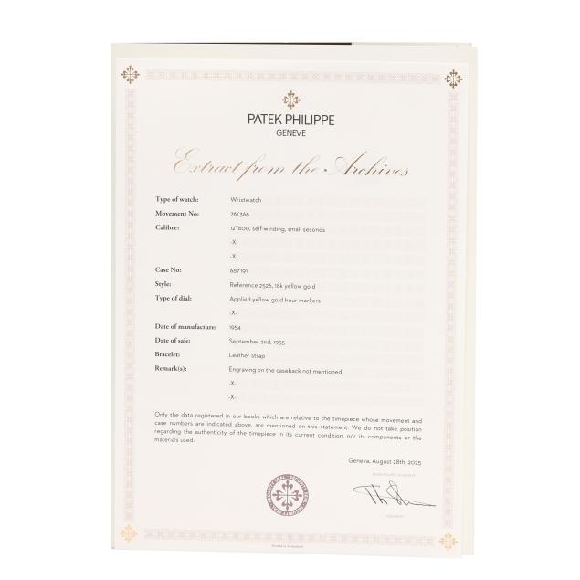 Robert A. Seidel, Executive Vice President of RCA, by descent to current owner. The Reference 2526 was the first automatic wristwatch from Patek Philippe, originally released in 1953.