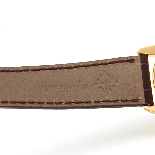Circa 1955, automatic, Patek Philippe 12-600 AT, movement number 761366, case number 687191, the round gold case with polished bezel, the double signed white dial with gold baton hour markers, gold Dauphine hands, and subsidiary second dial at 6:00 hour, the signed brown leather strap with gold buckle stamped with Swiss hallmarks and Au750, the caseback engraved Robert A. Seidel / R.C.A. and stamped with Swiss hallmark for 18KT on lug, the interior signed, numbered, and with Swiss hallmarks.