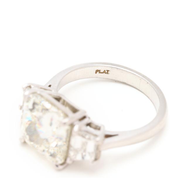 centered on a cut-cornered square modified brilliant cut diamond (9.47 x 9.40 x 6.68 mm) weighing 5.06 carats (actual) (K color, SI2 clarity) with a trapezoid cut diamond to each side weighing approximately 1.00 total carat (G-H color, VS1-VS2 clarity), completed with a shank stamped PLAT.
