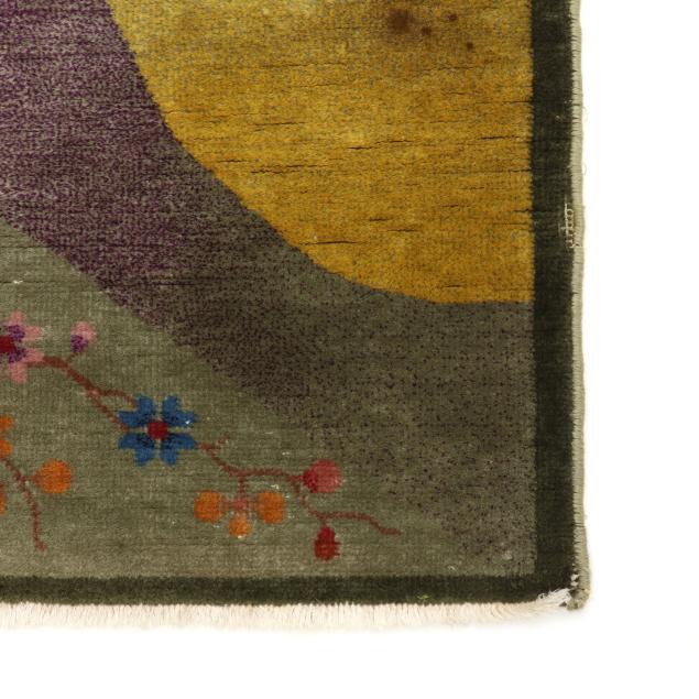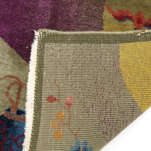 Republic period (1912-1949), circa 1930, having a mottled honey and forest green ground that is overlapped with large yellow and purple geometric shapes, flowering branches in a vase below a hanging floral arrangement with coin motif votive, four iron red bats fly across the center.