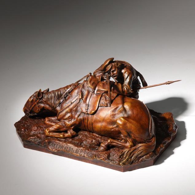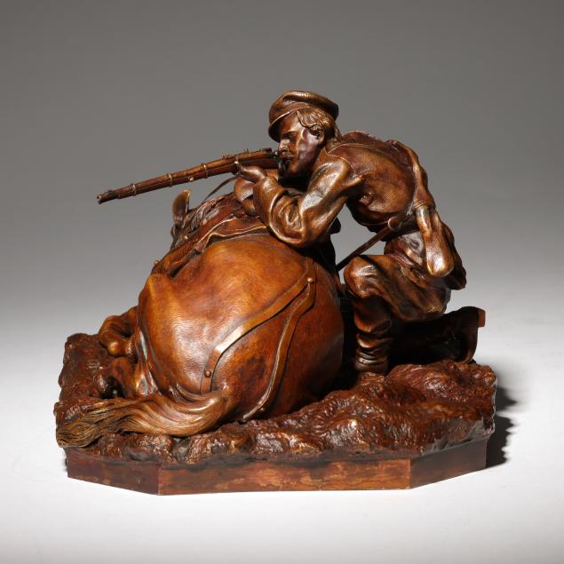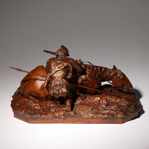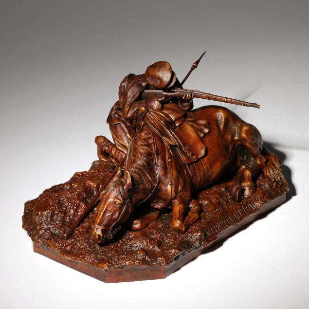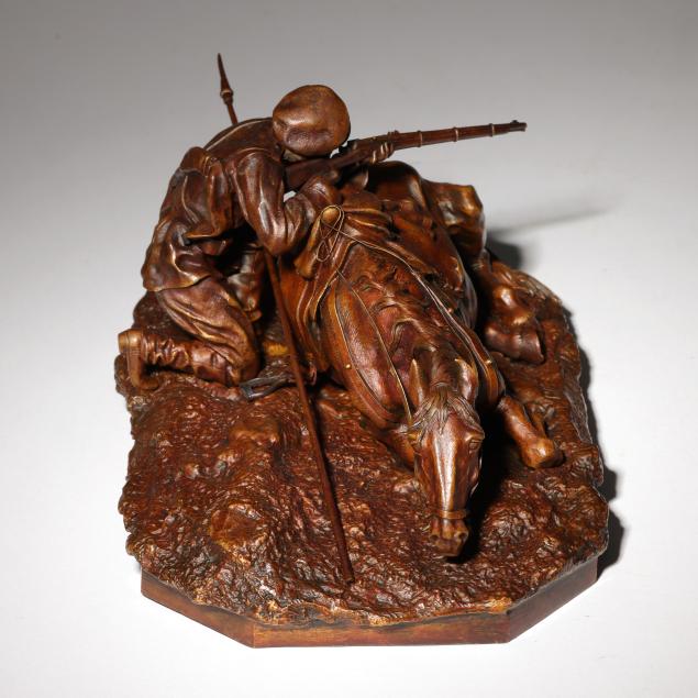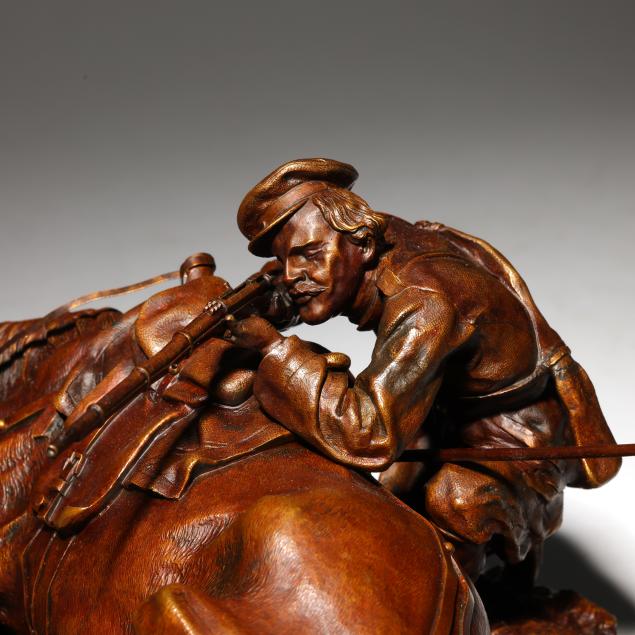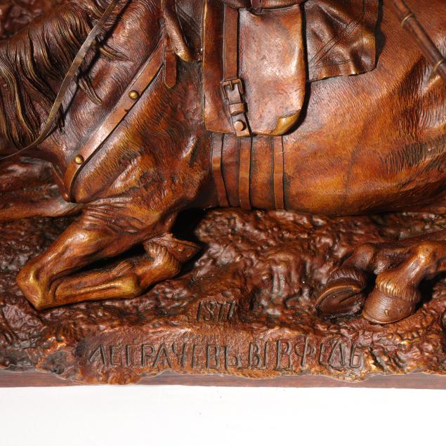 Grachev specialized in capturing gesture and movement in his sculptural works. The work here shows a Cossack infantryman aiming from behind his loyal mount during an intense moment in battle.