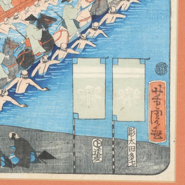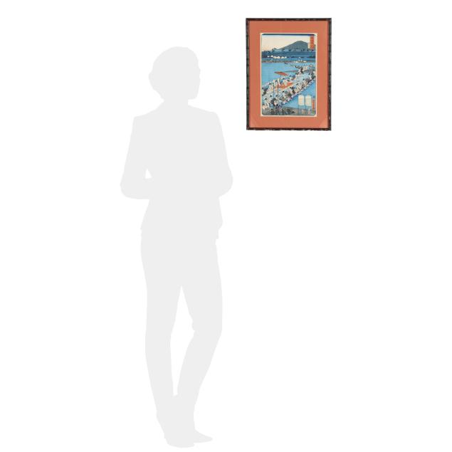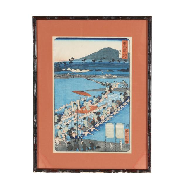 Circa 1863, woodblock print, a composition of the Abe River from the series "Scenes of Famous Places Along the Tokaido Road," presented under glass with a mat in dark brown faux bamboo frame.
