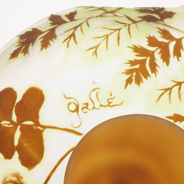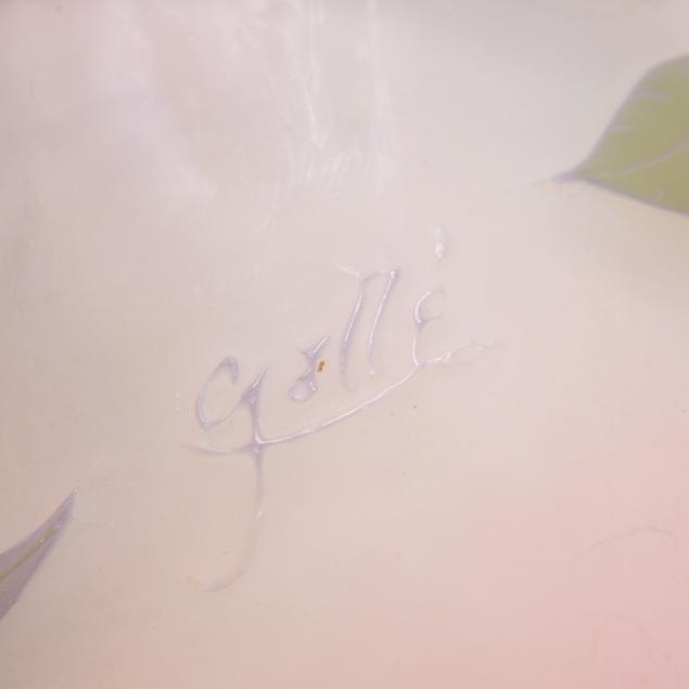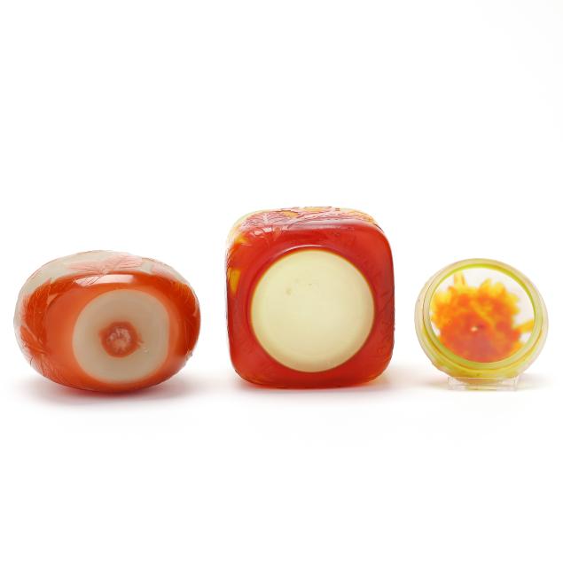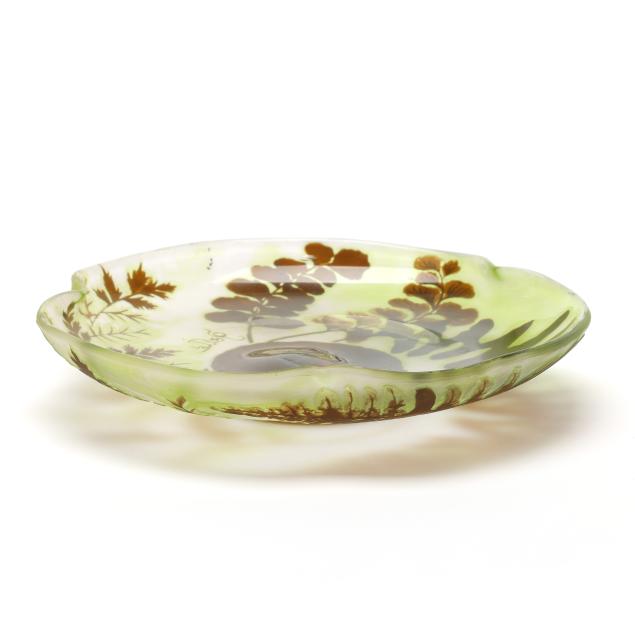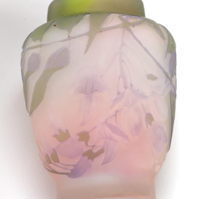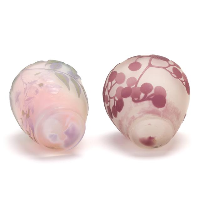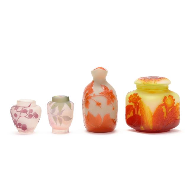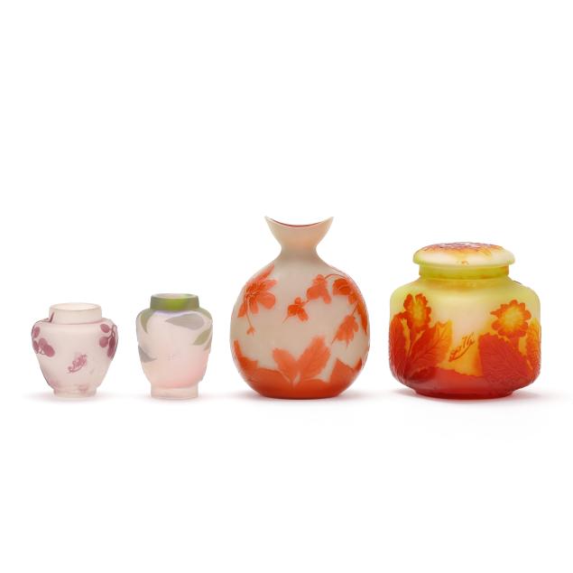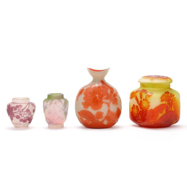 France, early 20th century, including a footed fern dish with tooled rim (7 in. diameter); a lidded floral jar (4.35 x 3.5 x 3.5 in.); a floral pillow vase with concave rim (5.5 in.); a wisteria cabinet vase (3 in.); and a purple berry cabinet vase (2.75 in.); all signed.