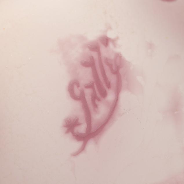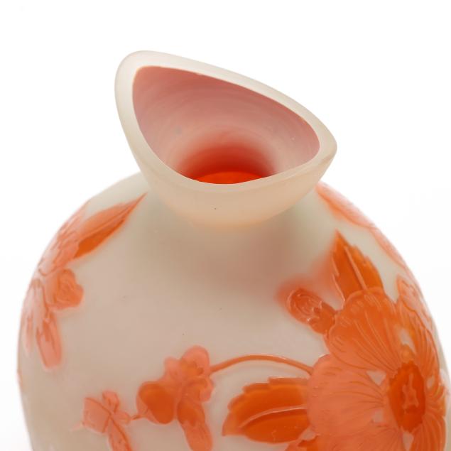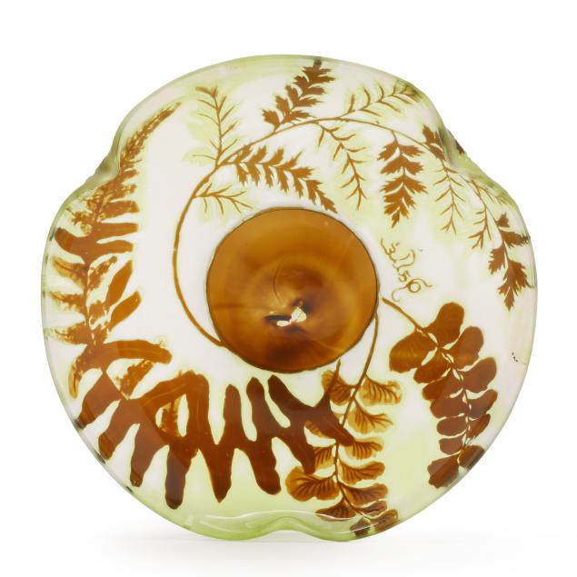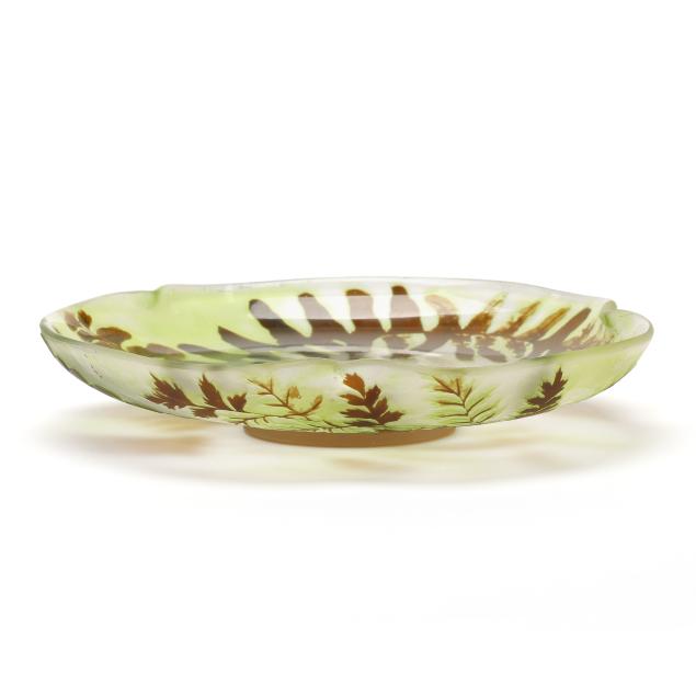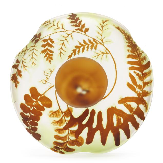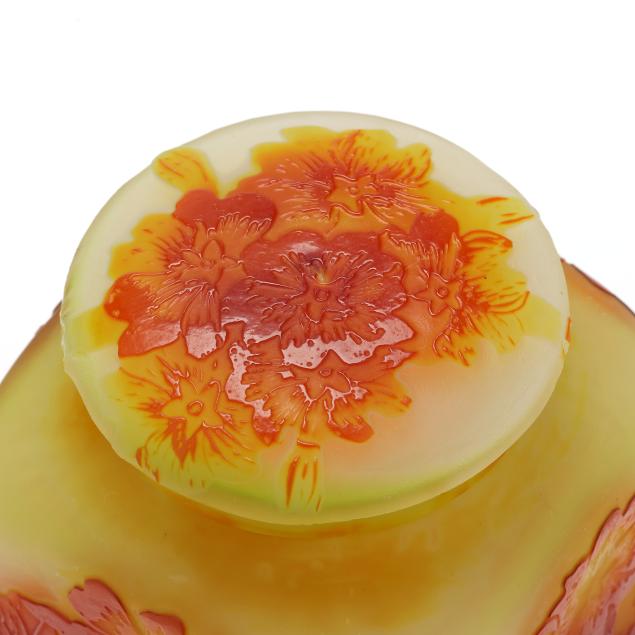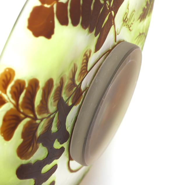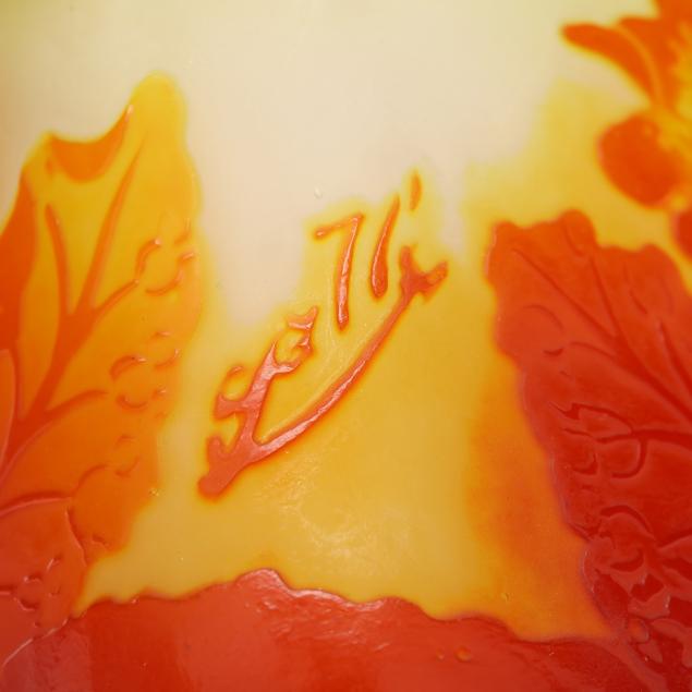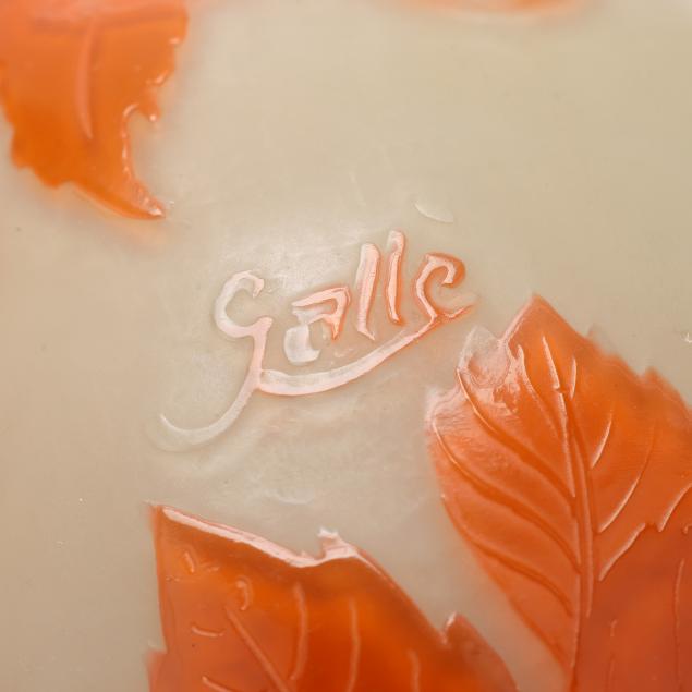 France, early 20th century, including a footed fern dish with tooled rim (7 in. diameter); a lidded floral jar (4.35 x 3.5 x 3.5 in.); a floral pillow vase with concave rim (5.5 in.); a wisteria cabinet vase (3 in.); and a purple berry cabinet vase (2.75 in.); all signed.