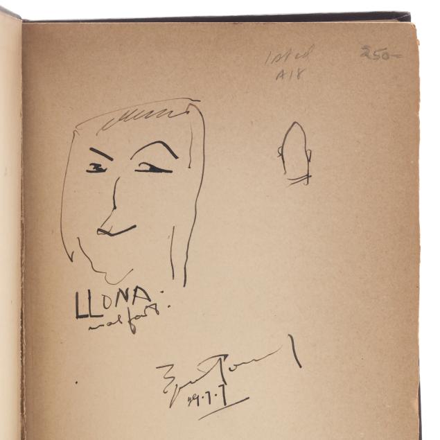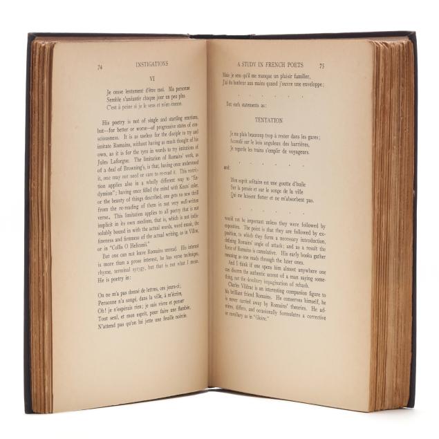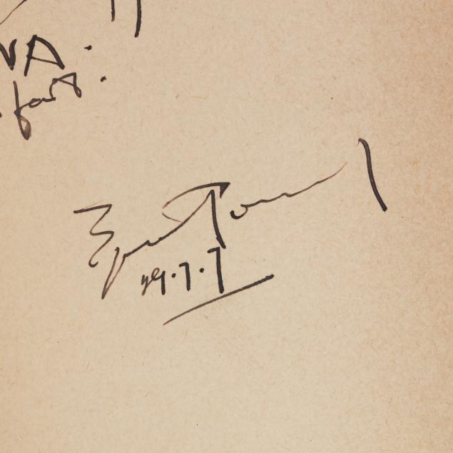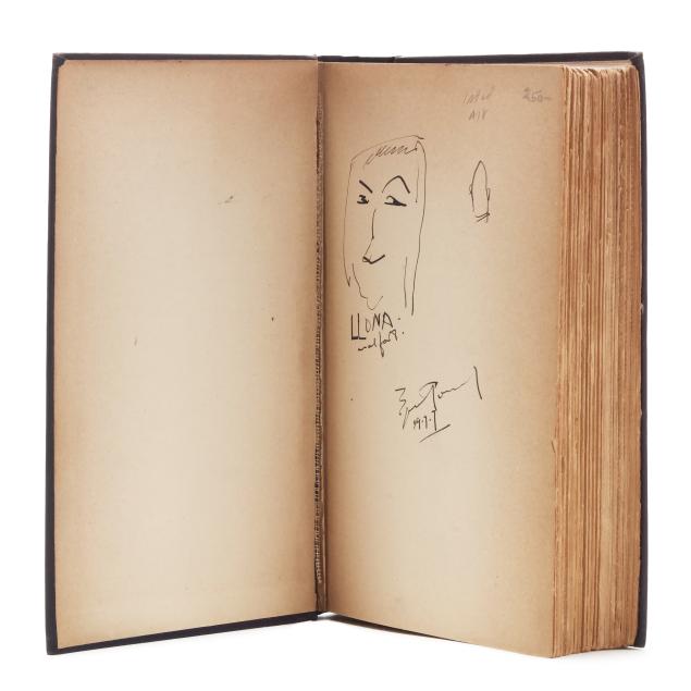 Ezra Pound. INSTIGATIONS OF EZRA POUND TOGETHER WITH AN ESSAY ON THE CHINESE WRITTEN CHARACTER BY ERNEST FENOLLOSA. New York: Boni and Liveright, 1920. First edition. Signed and dated by Pound on the first free endpaper below a small sketch. Hardcover. Purple cloth-covered boards stamped in blind on front cover and in yellow-green on the spine, with top edge stained slate. 8vo; viii, 388pp. Gallup A18.