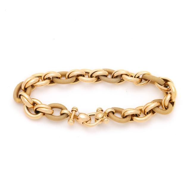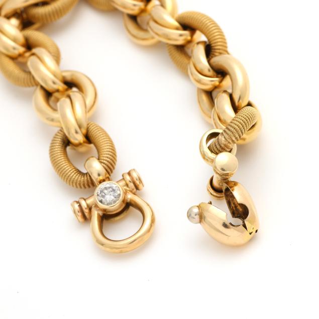 The bracelet consisting of alternating rope texture and polished links, connected by twist links, completed with a fold over clasp with a bezel set round brilliant cut diamond weighing approximately .70 carat (O-P color, I1 clarity), stamped 14K Italy.