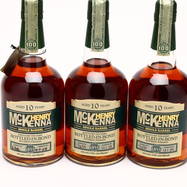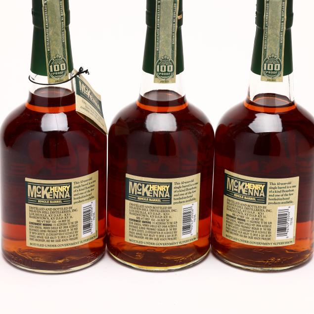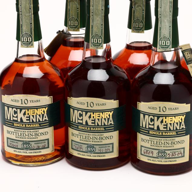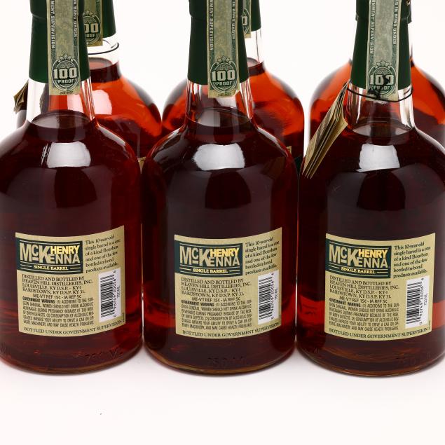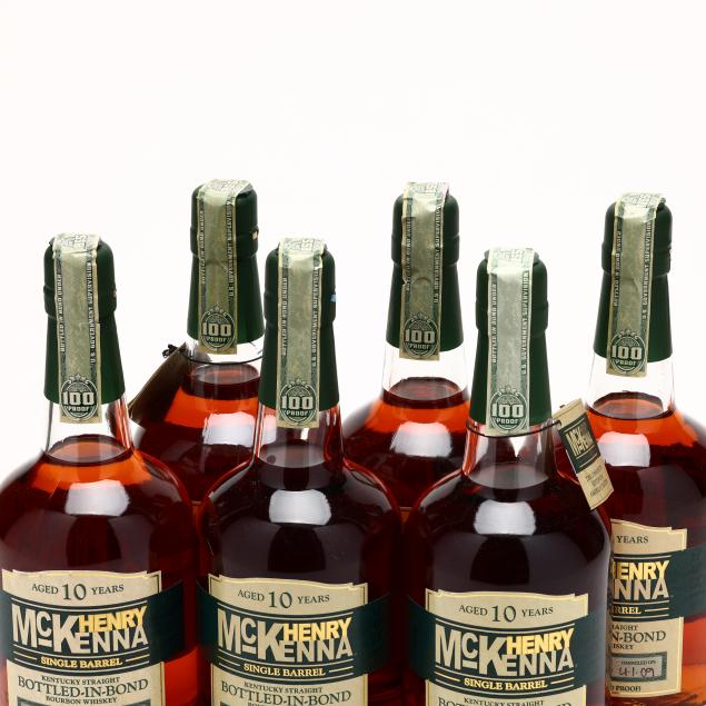 NV, Henry McKenna Single Barrel Kentucky Straight Bourbon Whiskey, Bottled in Bond, Aged 10 Years, Heaven Hill Distilleries, Inc., Louisville & Bardstown, KY, 50%, barrel nos. 5959 (barreled 11-20-08), 6809 (barreled 5-23-09), 7609 (barreled 4-1-09) & 6346 (barreled 4-1-09), 6 into neck, 6 sealed, includes 2 original hanging tags (6 750 ml)