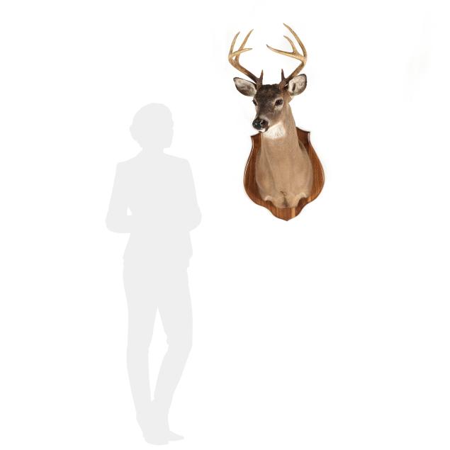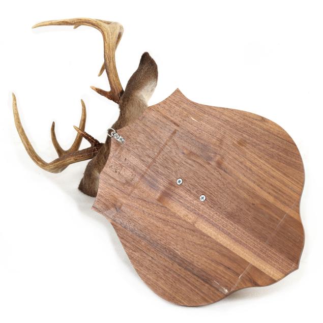 Measures 34.5 in. from tip of highest antler point to base of wooden plaque, 20 in. from tip of nose to wall mount, 14 in. wide plaque, eight antler points, oak wall plaque.