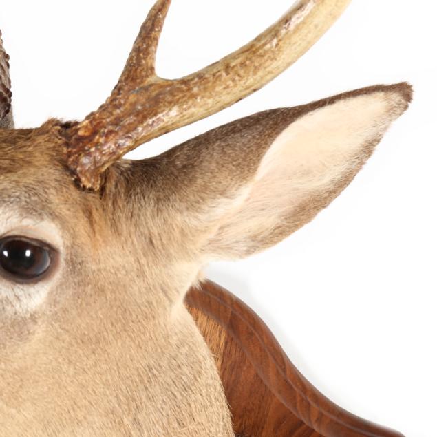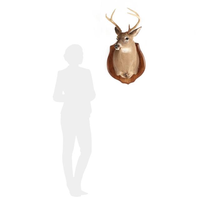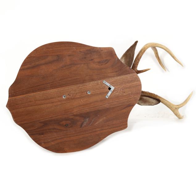 Measures 31 in. from tip of highest antler point to base of wooden plaque, 23 in. from tip of nose to wall mount, 17 in. wide plaque, five antler points, oak wall plaque.