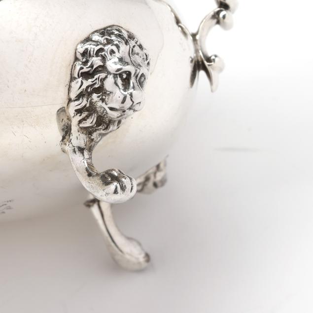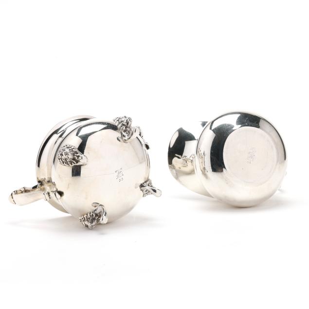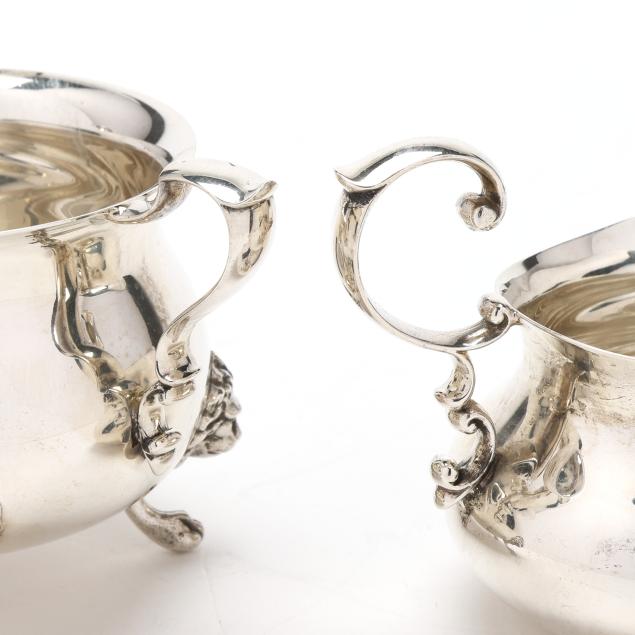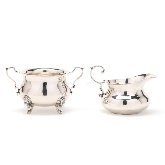 The sugar bowl, pattern number 33, featuring lions head knees and paw feet (2 3/4 x 5 x 3 1/8 in.); the creamer, pattern number 66, with a scrolled handle (3 in.); not monogrammed.