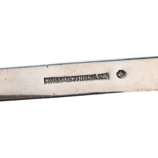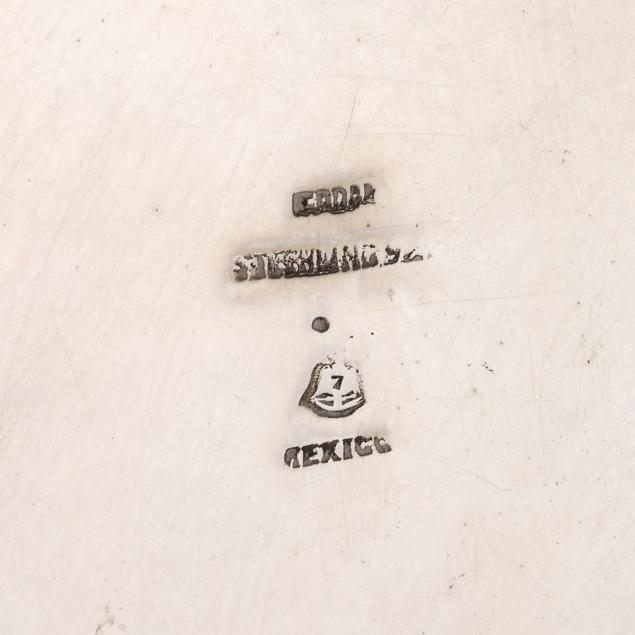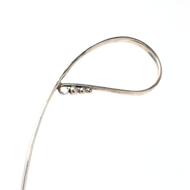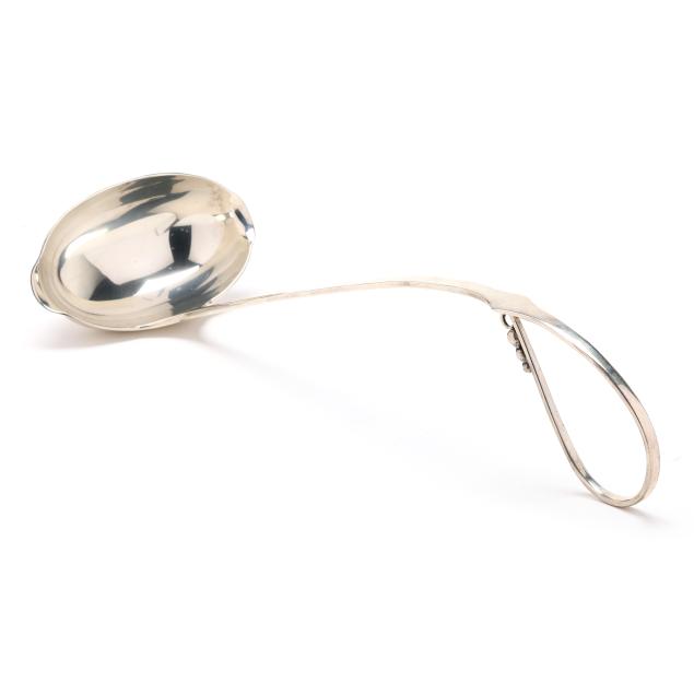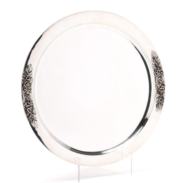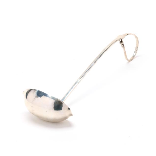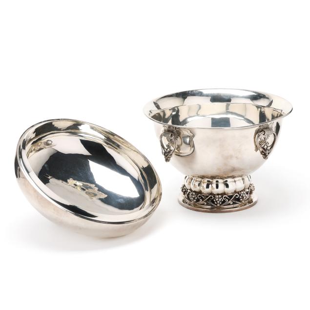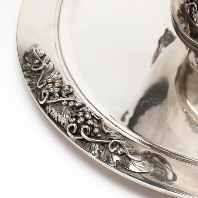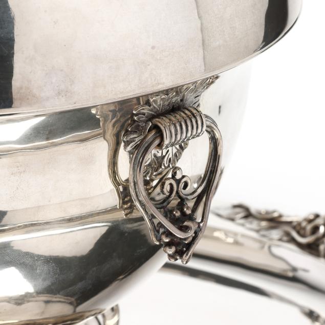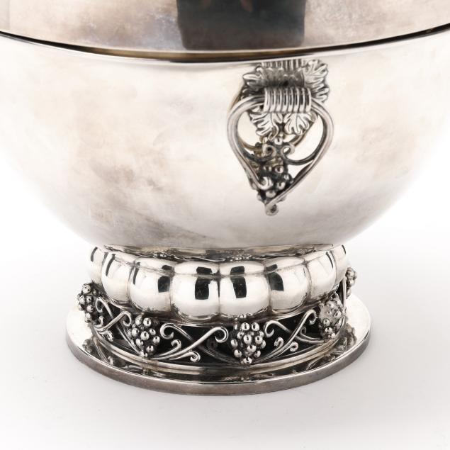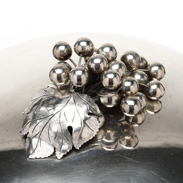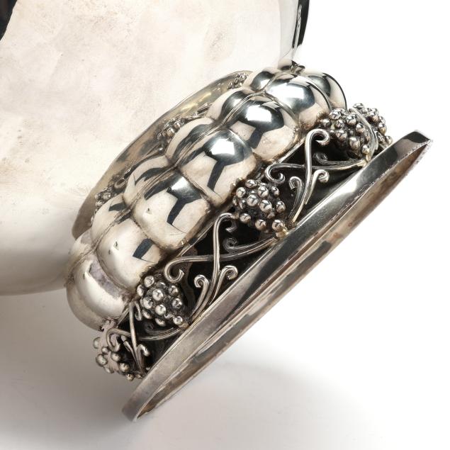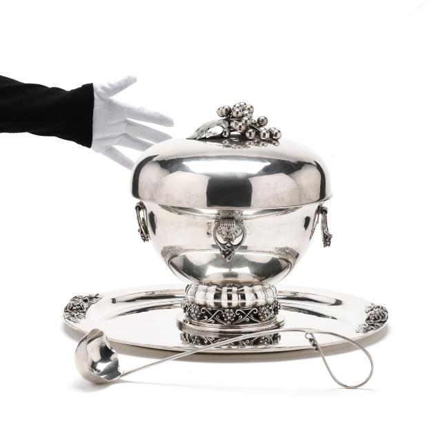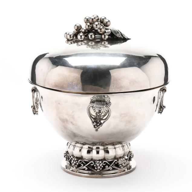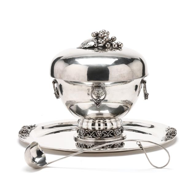 Second half of the 20th century, in the Danish modernist style inspired by Georg Jensen, the large covered bowl topped with a bundle of grapes and leaf finial, over a rim with four wirework swing handles, raised on a lobed and openwork pedestal base, together with a uniform under plate, the grape motif repeating throughout; the ladle in with a looped handle decorated with ball ornaments; not monogrammed.