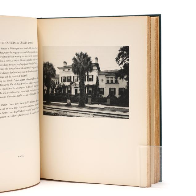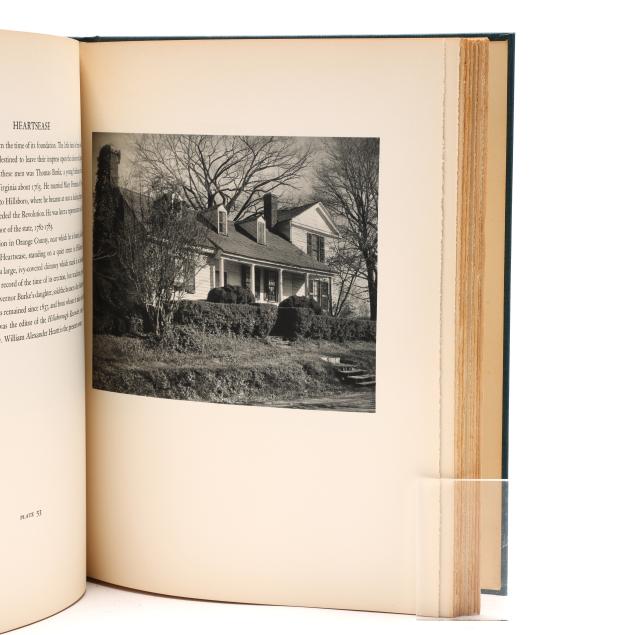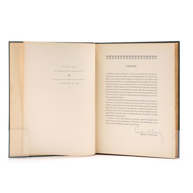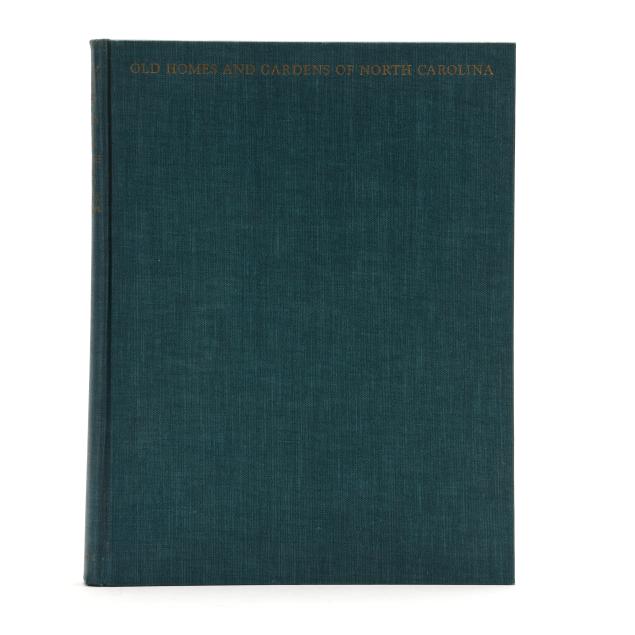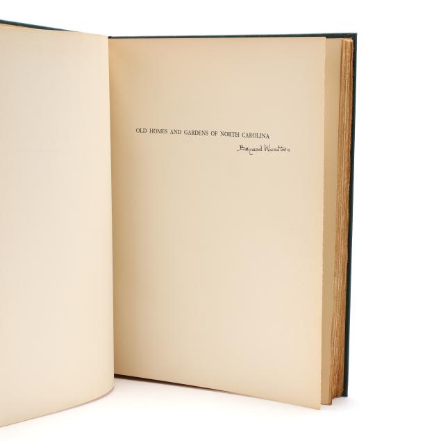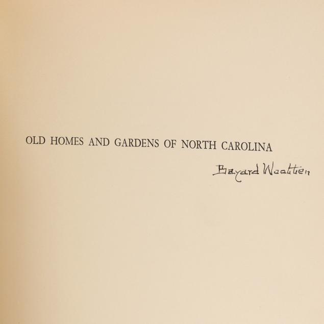 Archibald Henderson; Bayard Wootten; compiled by Charles A. Cannon, et al. OLD HOMES AND GARDENS OF NORTH CAROLINA. Chapel Hill: The Garden Club of North Carolina and The University of North Carolina Press, 1939. Limited edition; number 781 of 1000 copies. Signed at the forward by NC Governor Clyde R. Hoey. This copy additionally signed by Bayard Wootten on the half-title. Hardcover. Gilt-stamped cloth-covered boards. Small folio; xii, 34, (100) plates with descriptions (photographs by Bayard Wootten), xxiii-xxiipp.