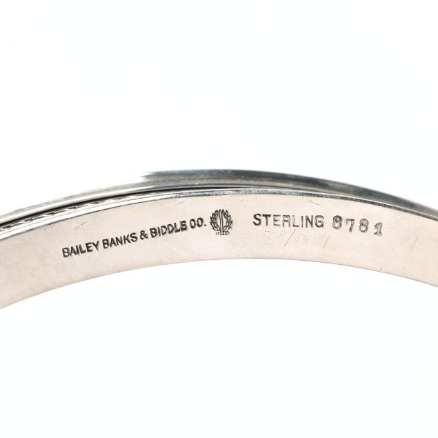 Pattern number 8781, retail mark of Bailey, Banks & Biddle Co., featuring a swing handle, reticulated gallery, and flattened ball feet, fitted with a pressed glass divided dish, not monogrammed.