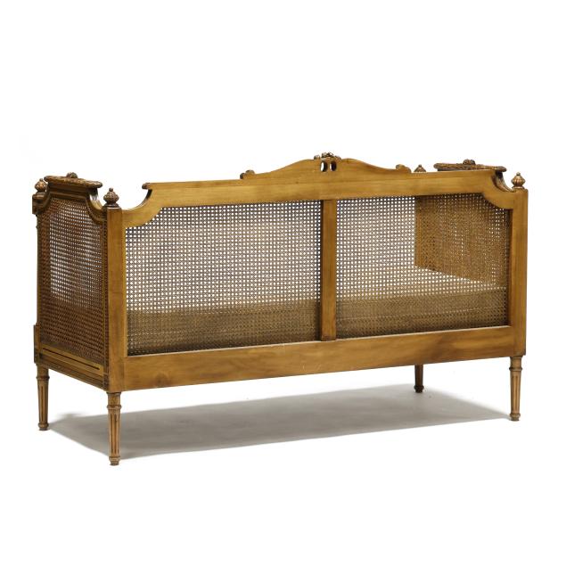 Late 20th century, carved fruit wood frame with cane back and sides, loose seat cushion, fluted legs.