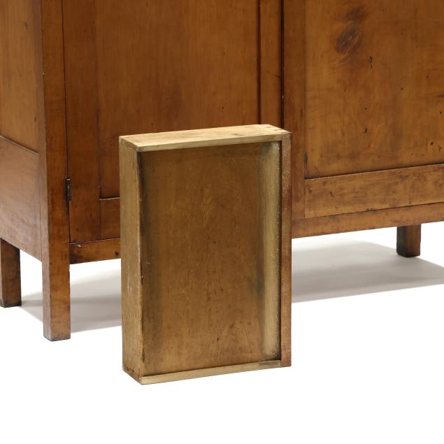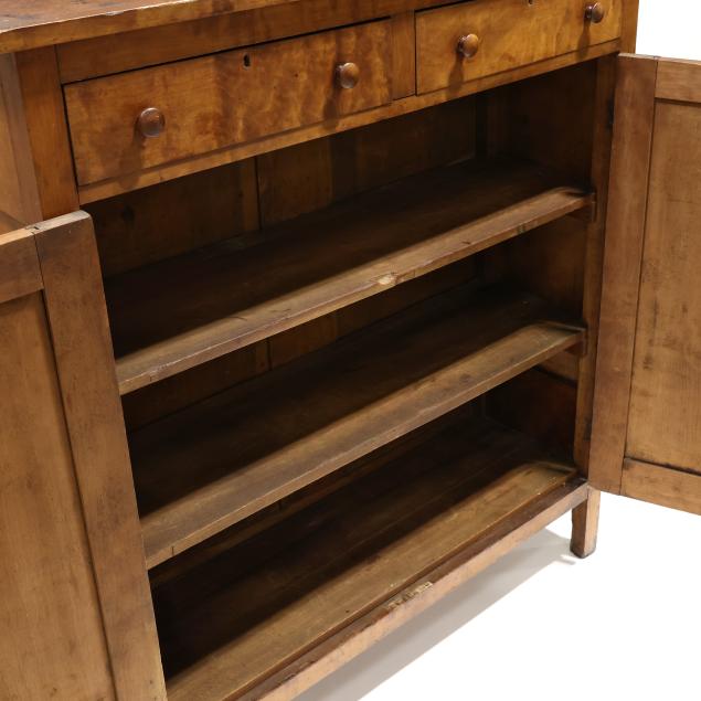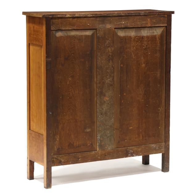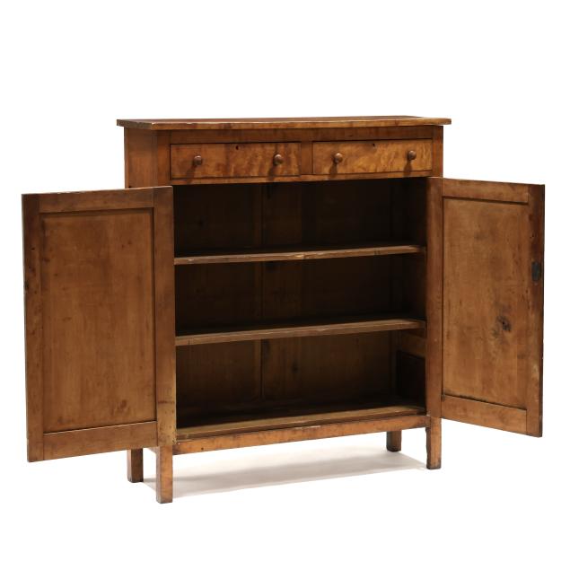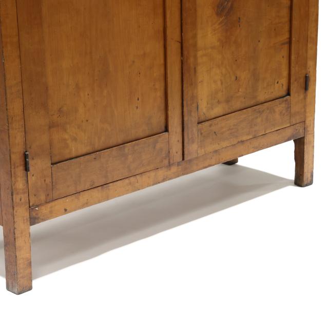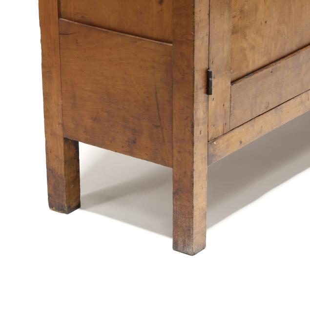 Mid 19th century, poplar secondary, one board top, two flush drawers over two hinged paneled doors, shelved interior, paneled sides, straight legs from the solid.
