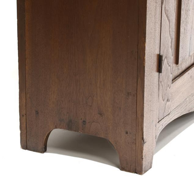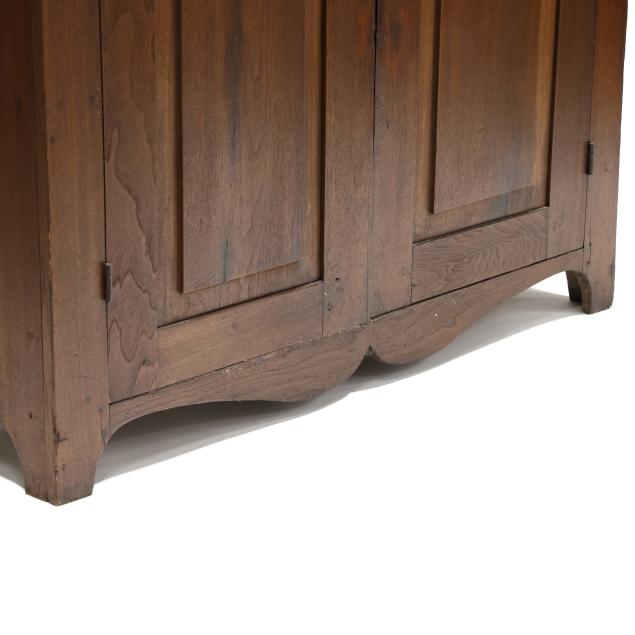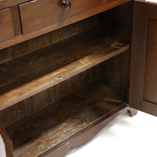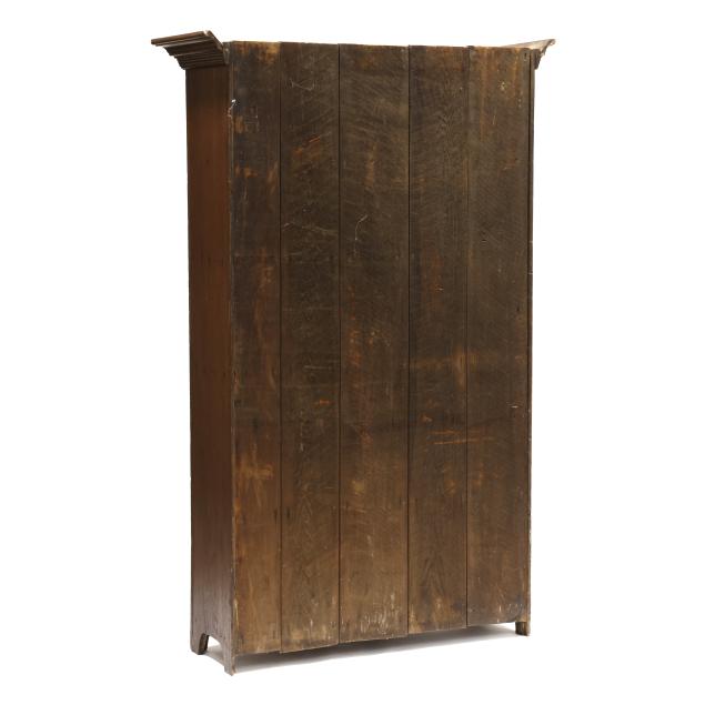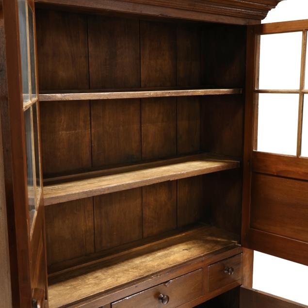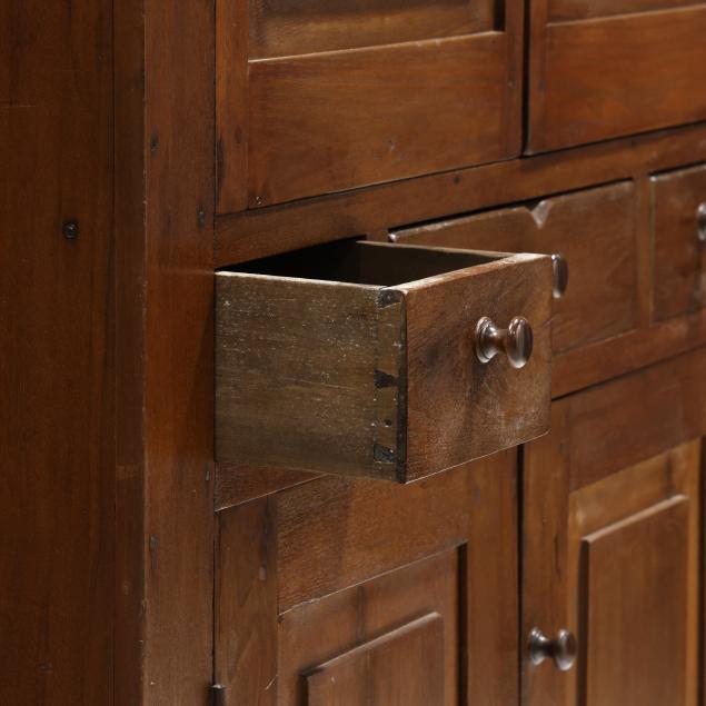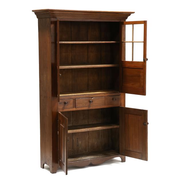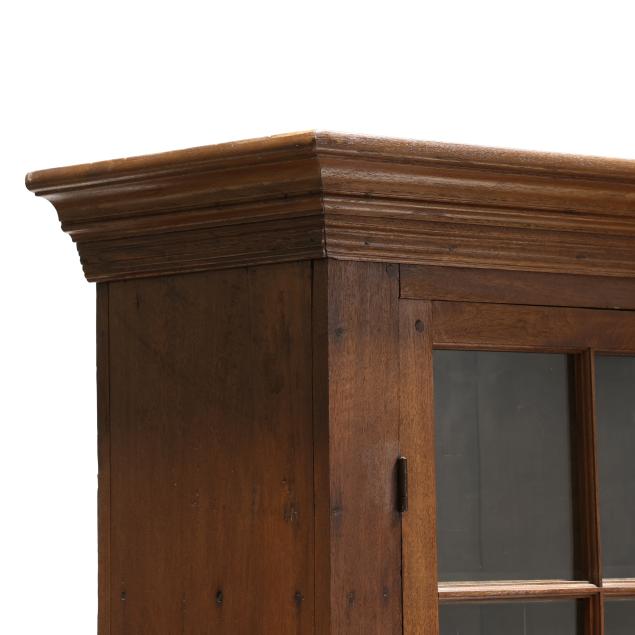 Attributed to Piedmont region of North Carolina, circa 1840, poplar secondary, one part form, deep cove molded cornice, two upper hinged cabinet doors with four window lights each, molded mullions over tall raised "dirty dish" panels, shelved interior with plate rails, over three side-by-side flush drawers, over two hinged raised panel cabinet doors, shelved interior, flush sides, straight feet from the solid.