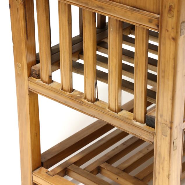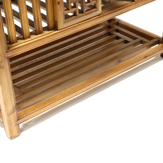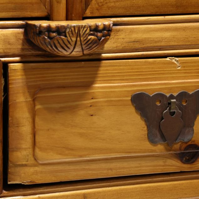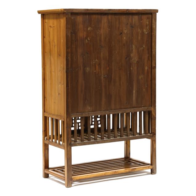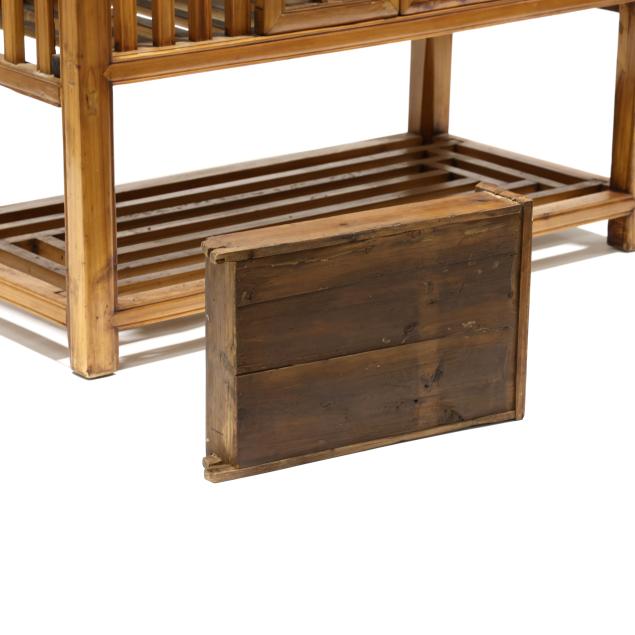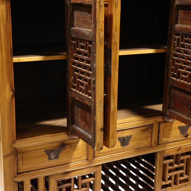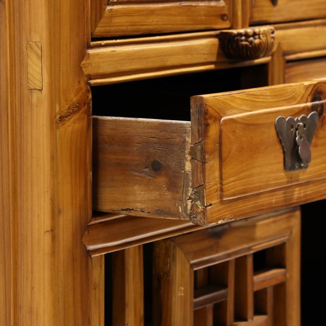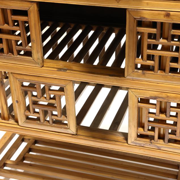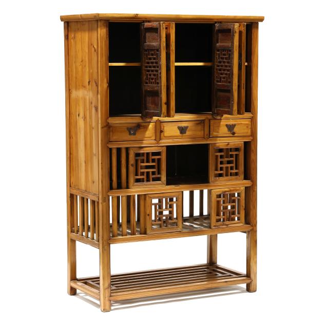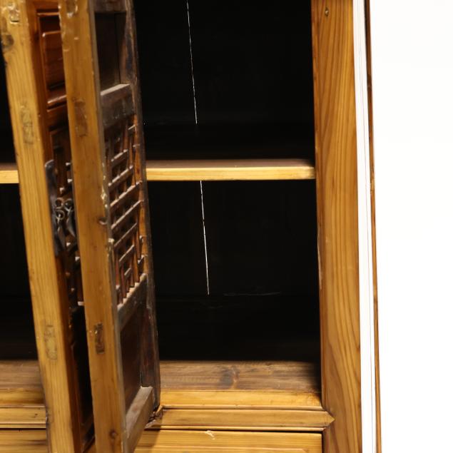 Second half 20th century, one part form, consisting of four hinged upper fretwork doors with divided and shelved interior, three raised panel side-by-side drawers over four sliding open panel doors with open slat shelf interiors, lower open slat shelf, straight legs, through tenon and dovetailed joinery.