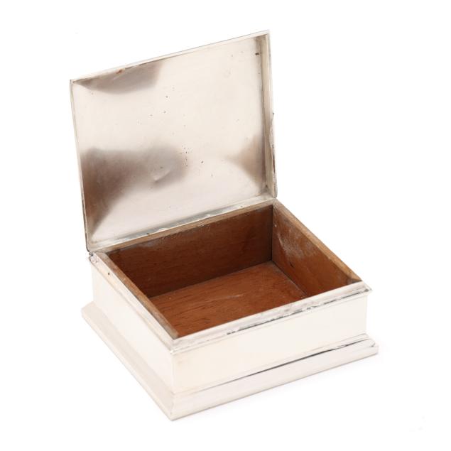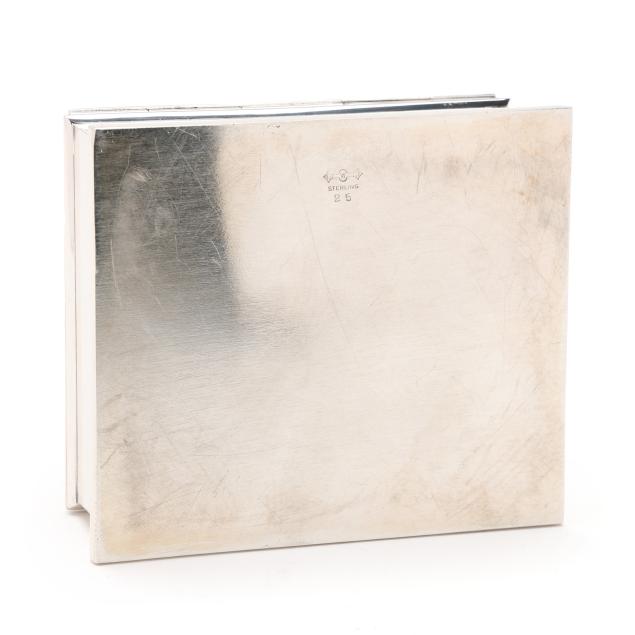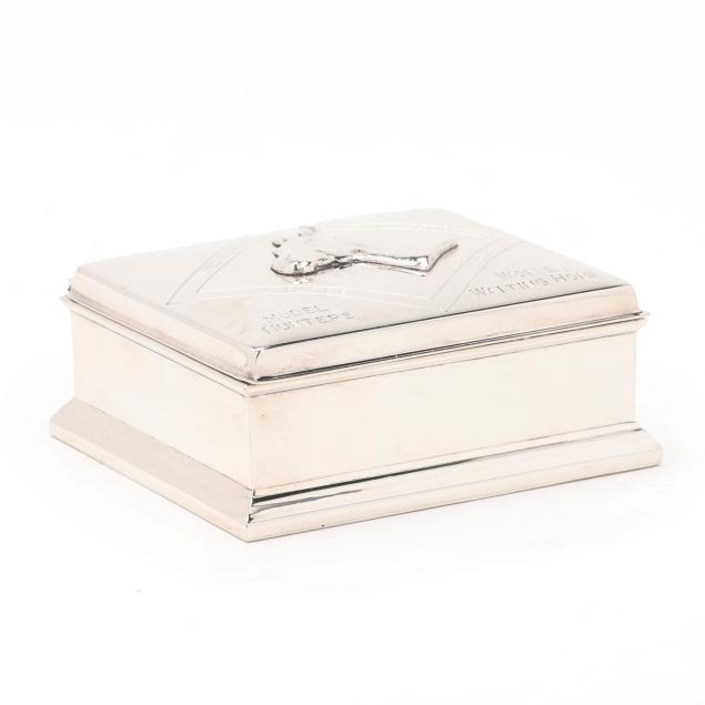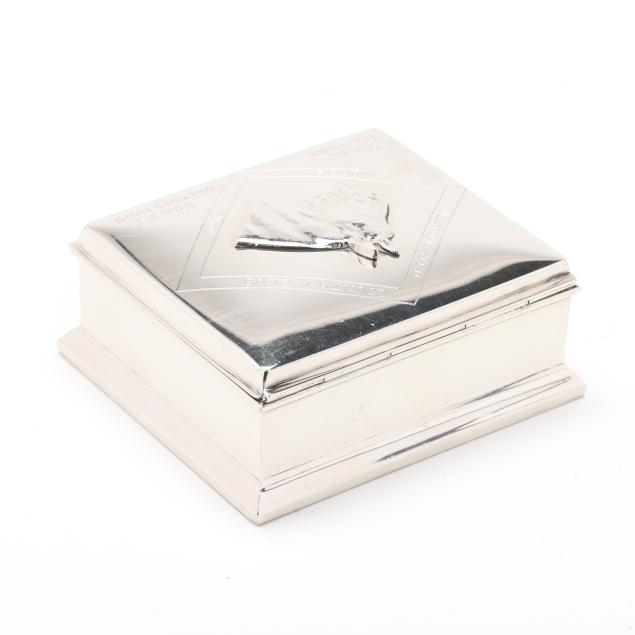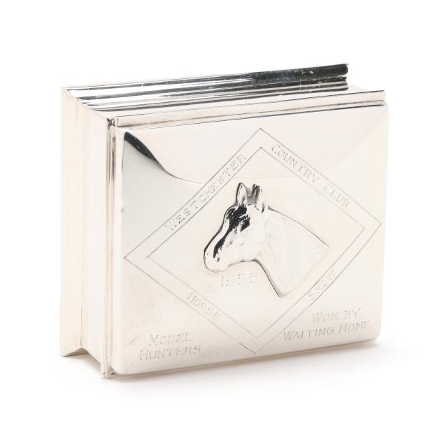 Mark of Graff, Washbourne & Dunn, pattern number 25, the lid featuring a horse head in profile, engraved "Westchester Country Club Horse Show / 1956 / Model Hunters / Won by
