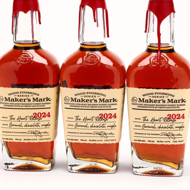 NV, Maker's Mark Kentucky Straight Bourbon Whisky Barrel Finished with 10 Virgin Oak Staves, Wood Finishing Series 'BR-22A: The Heart Release', Loretto, KY, 55.85%, limited 2024 release, 3 into neck, 3 sealed, 3wxc (3 750 ml)
