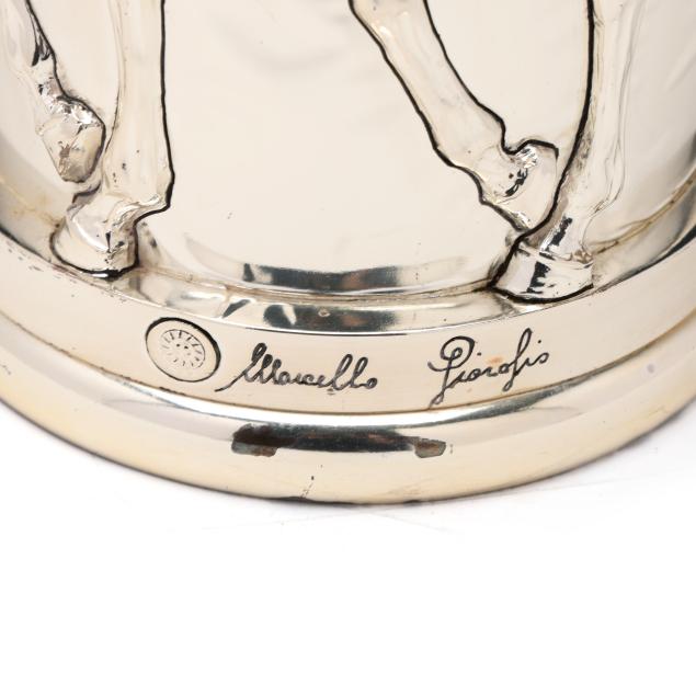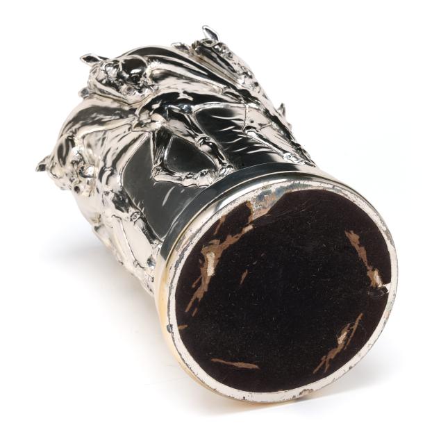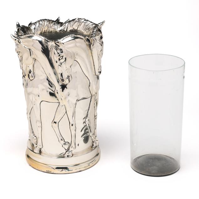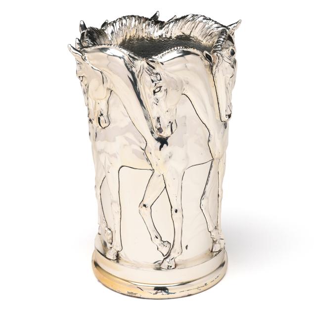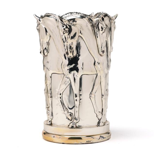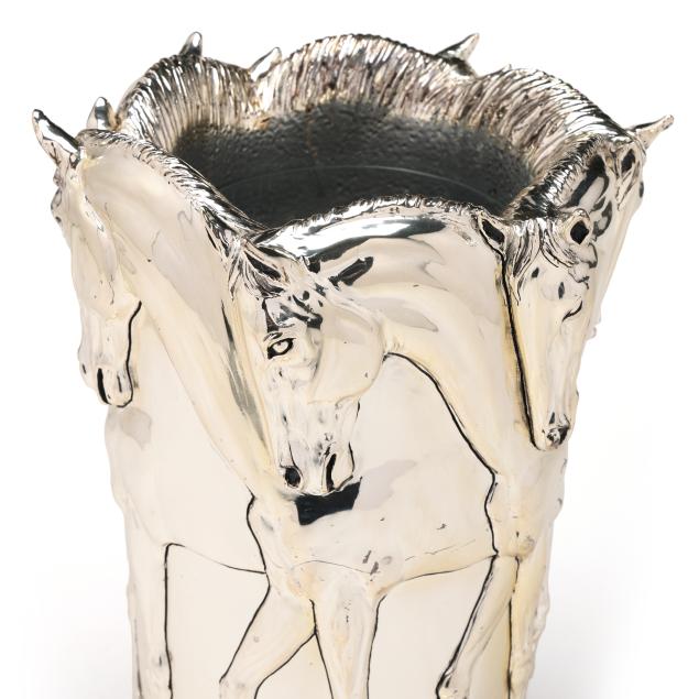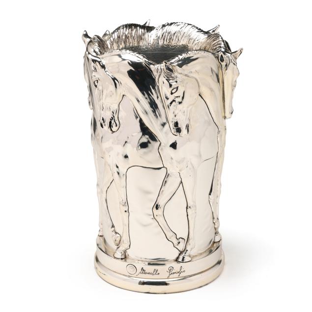 Italian, with a resin core, cylindrical form with six naturalistic horses in high relief, signed to the base.