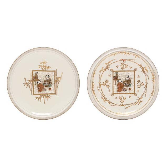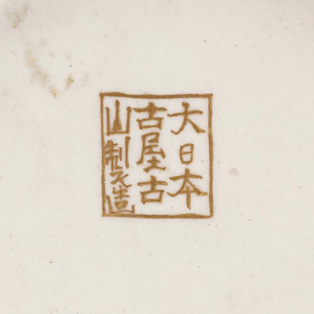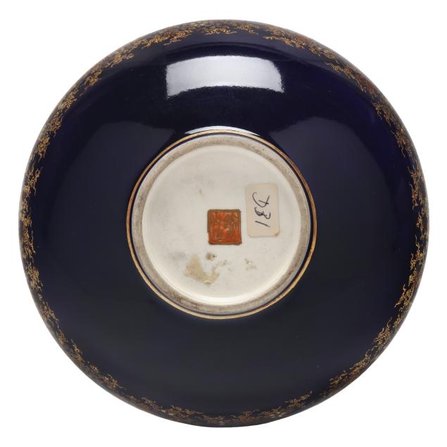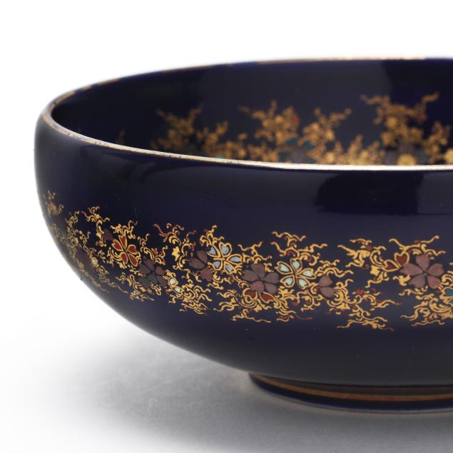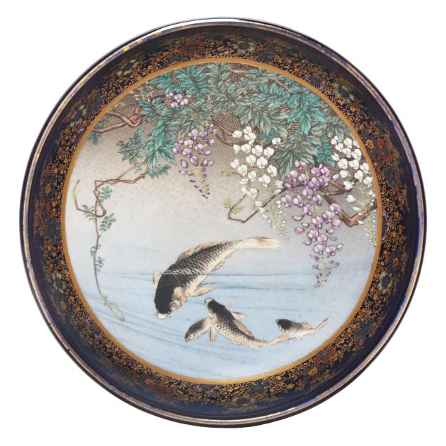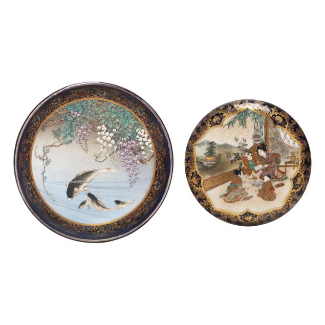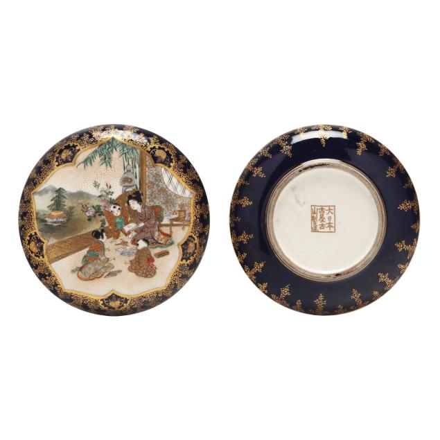 Meiji period (1868-1912), includes two satsuma artworks, the first a bowl finely painted with two fish swimming in water to the well, the interior and exterior sides in a rich cobalt blue ground with gilt floral decoration, with 錦光山製 (Kinkozan zo) "made by Kinkozan" mark in gilt and red to underside, and the second, a round and slender box with cover, painted with great detail to the cover and both sides of the interior, with 大日本古屋古山製造 (dai Nippon Furuya Furuyama sei zo) "made by Furuya Furuyama in Great Japan."