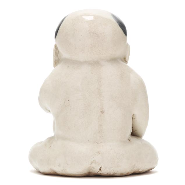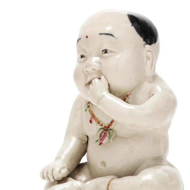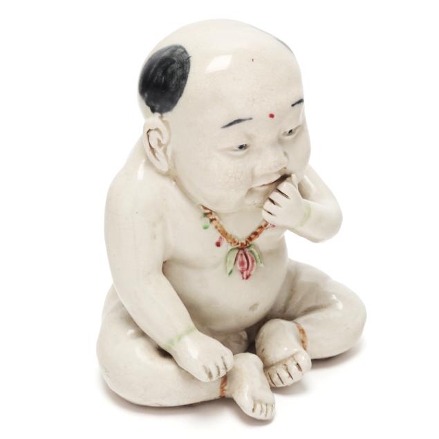 Republic period (1912-1949), a cute full faced boy with one hand raised up to his mouth, teeth showing, wearing a peach necklace and green jade bracelets, iron red rings encircle his ankles, surface with scattered small crackle to glaze.