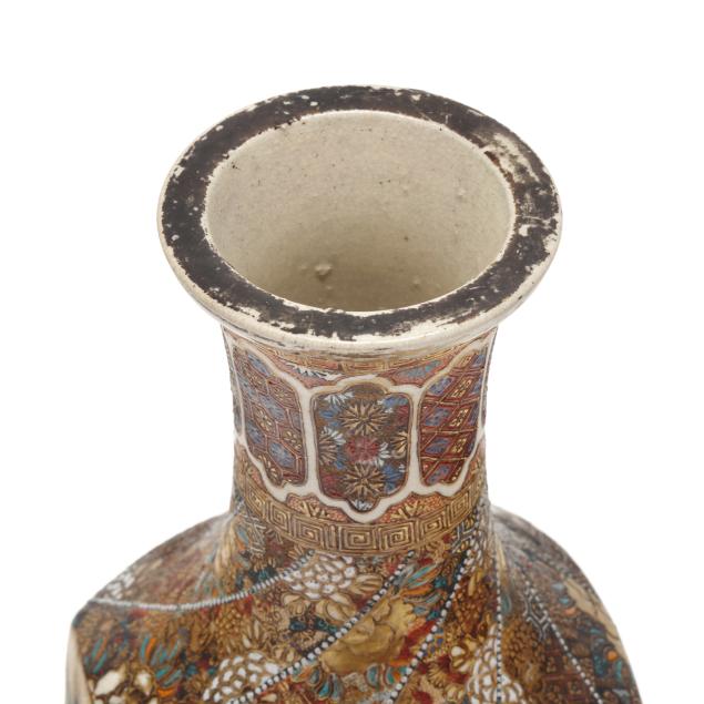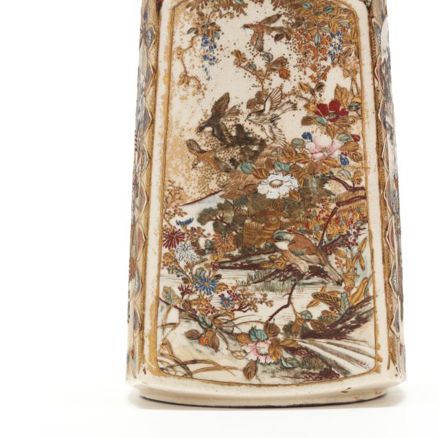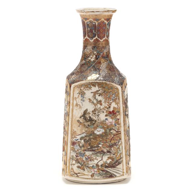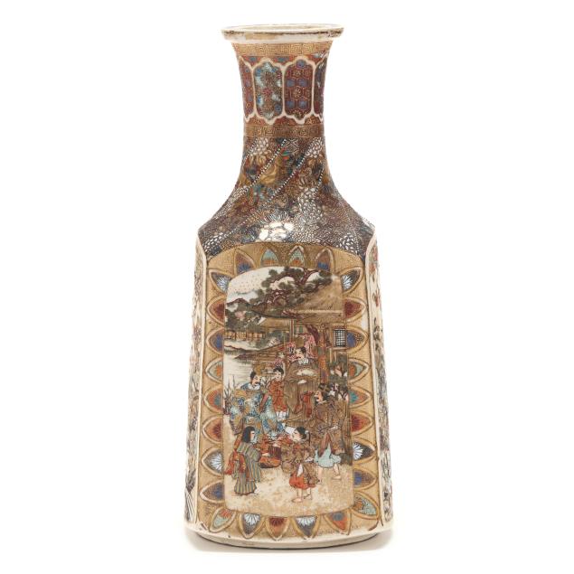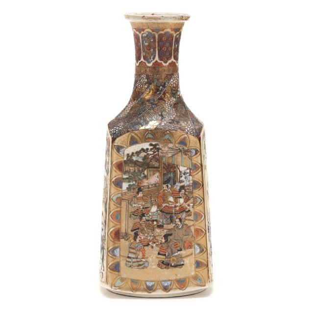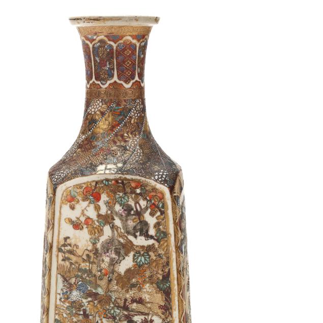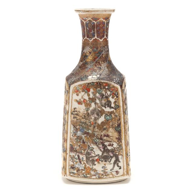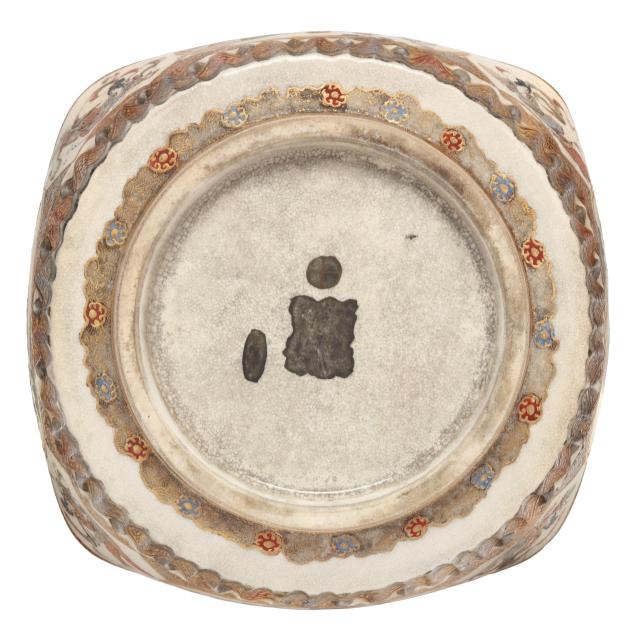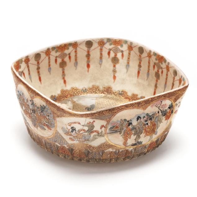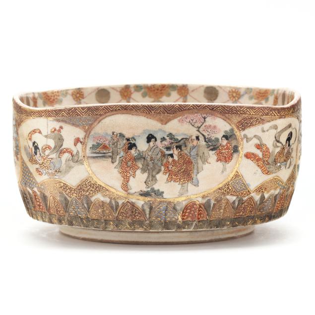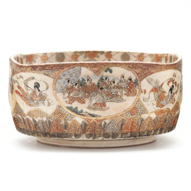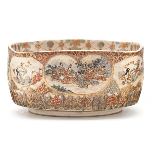 Edo period (1615-1868) or Meiji period (1868-1912), 19th century, includes two lovely Satsuma pieces, the first a square shaped Satsuma bowl hand painted to interior garland of hanging jewels from chrysanthemum blossoms, the interior well with image of figures at leisure in a riverside pavilion, exterior with alternating fan and lobed vignettes containing flying aspara goddess figures and scenes of groups gathered in outdoor landscapes, patterned molded bottom rim above short foot, with three marks to underside that have been rubbed and are no longer legible, comes together with wooden tomobako box (2 3/4 x 6 x 6 in.)(two hairline cracks to rim at lower left corner; three marks to underside discolored and writing indiscernible), and the second, a four sided sake bottle with elaborate textile and brocade patterning decoration to neck, each of the four sides with different detailed scenes of warriors and nature, especially nice is the side with monkeys picking persimmons (10 1/4 x 4 x 4 in.)(some rubbing with loss to gilt around the rim.)