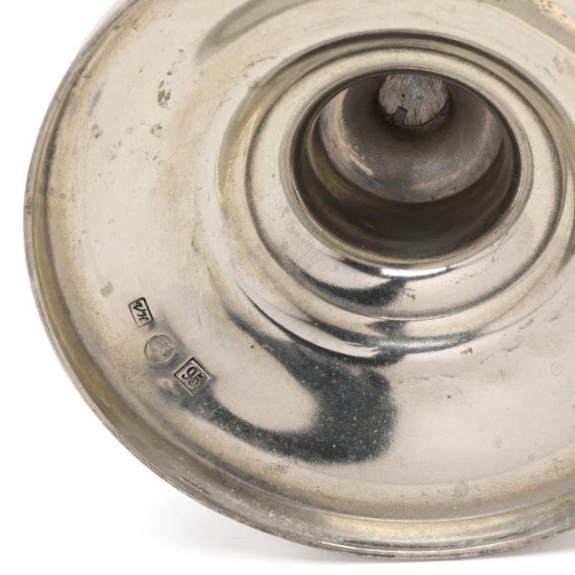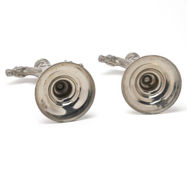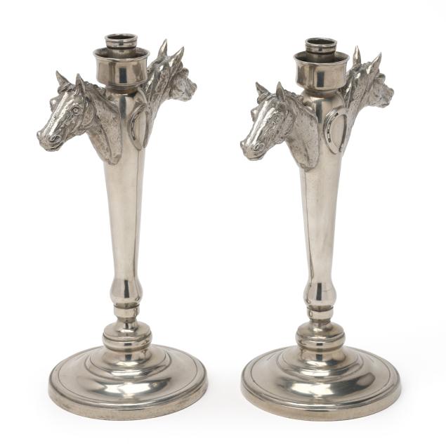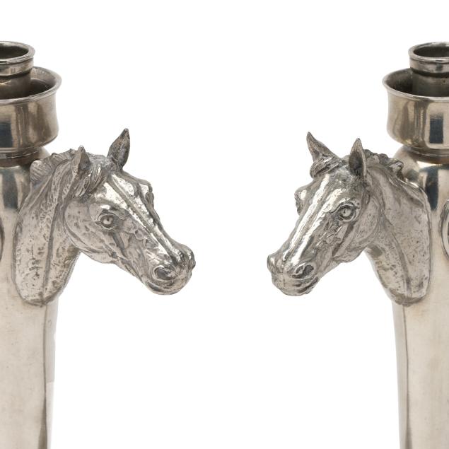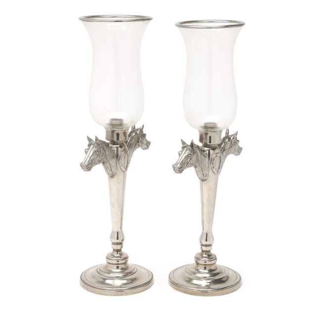 Contemporary, each featuring double horse heads and horse shoe motifs to the shoulder, baluster forms, fitted with glass hurricane shades, marked to underside.