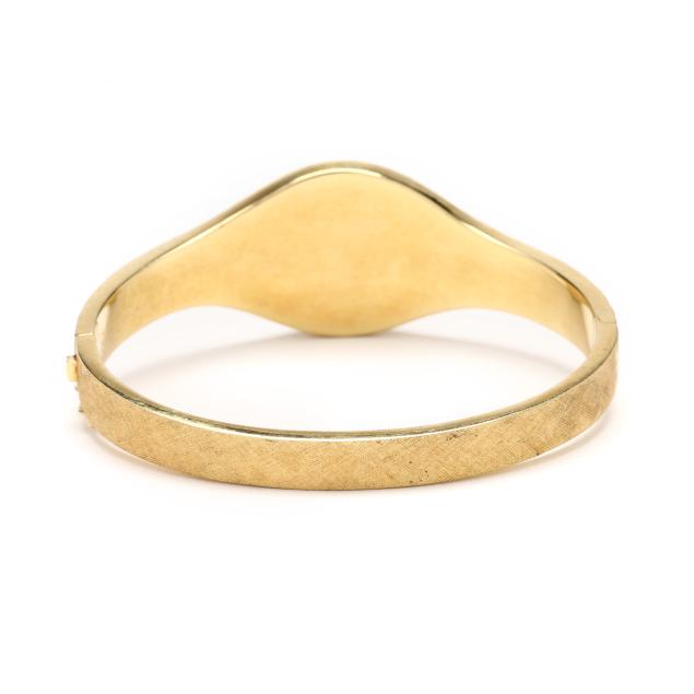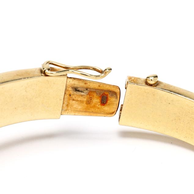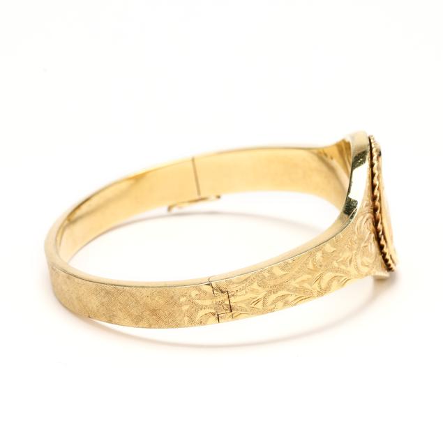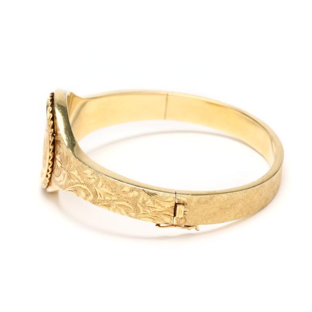 The hinged bangle bracelet centered on an Austrian Ducat showing the crowned imperial double eagle and dated 1915, with rope twist surround and foliate and scroll design to shoulders with Florentine finish to bracelet, completed with an integrated box clasp and with figure eight safety, stamped with a partial stamp and 585.