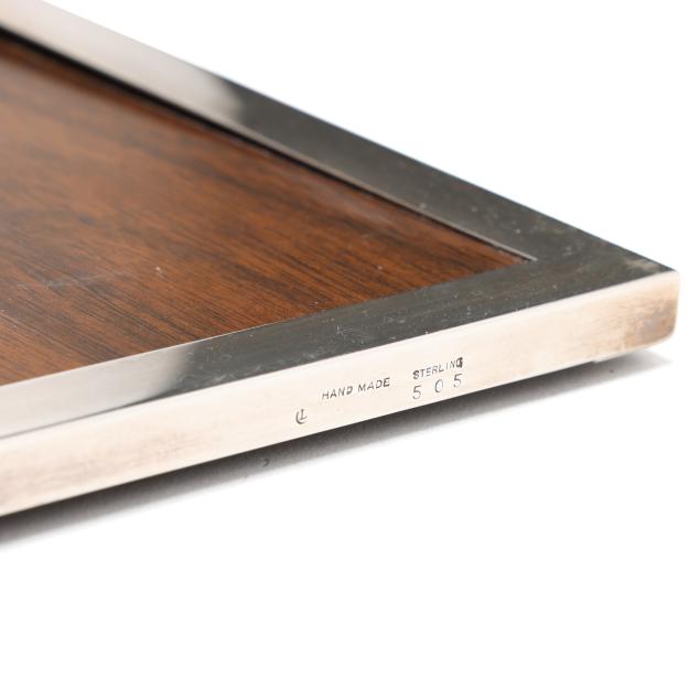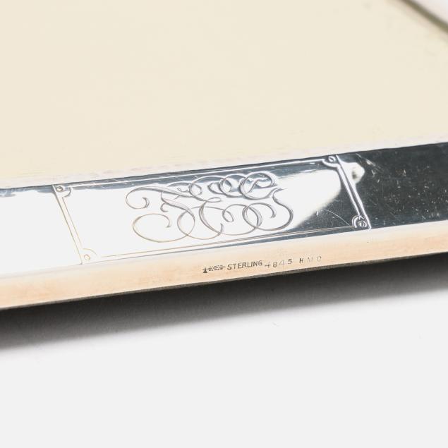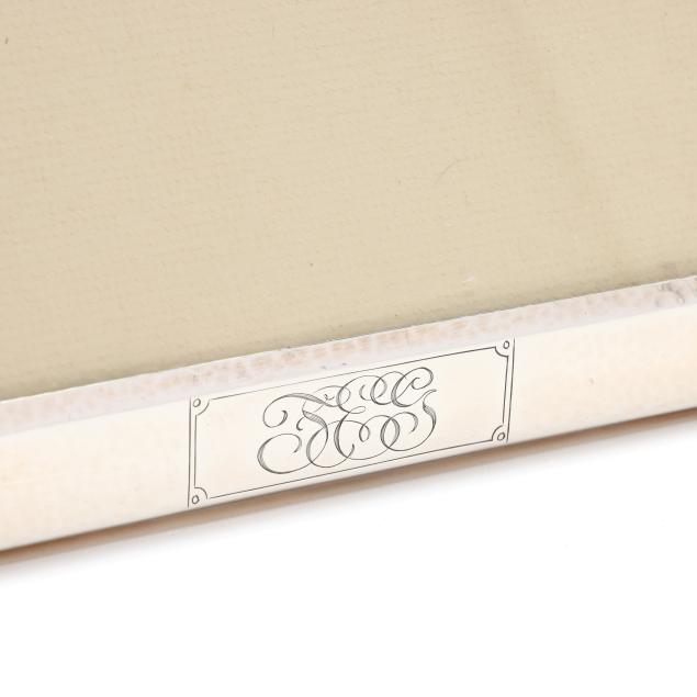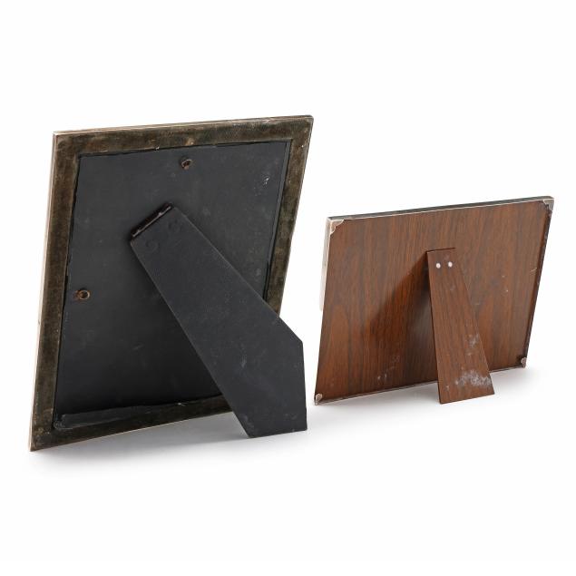 The first, a double frame, mark of Lebkuecher & Co., pattern number 505, not monogrammed, without glass (7 1/8 x 9 5/8 in.); the second, mark of William B. Kerr & Co., pattern number 4845, hand made, featuring a hammered surface and script monogram (11 1/4 x 9 in.).