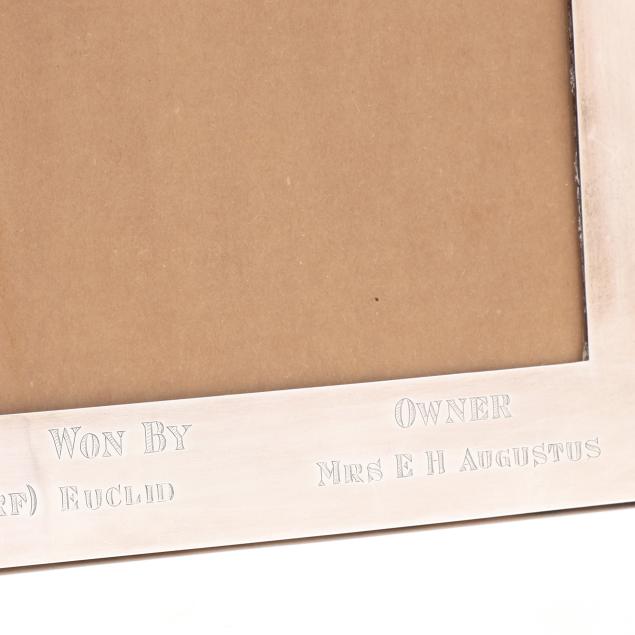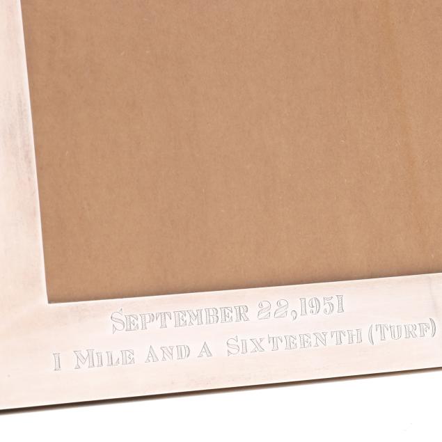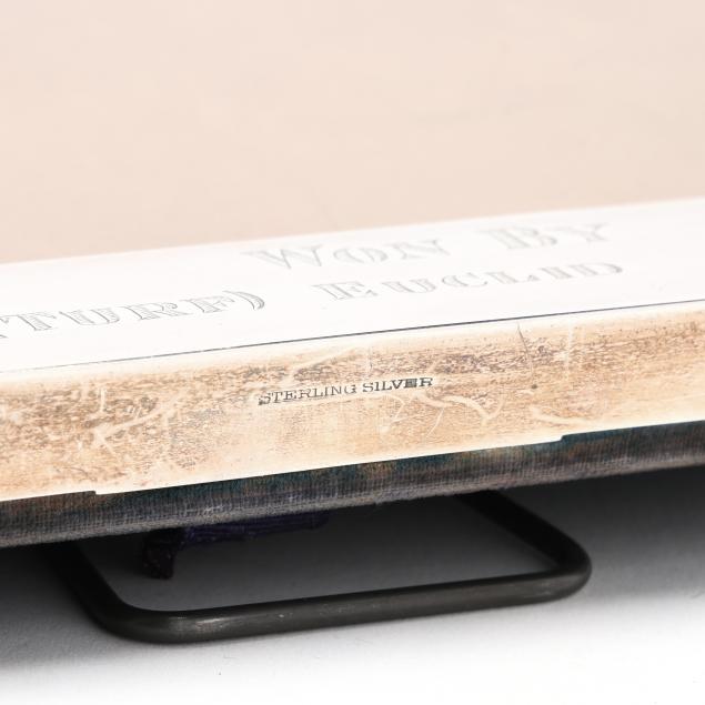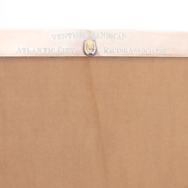 Marked "Sterling Silver" featuring a gold toned and enameled mount to upper center, engraved "Wentnor Handicap / Atlantic City Racing Association / September 22, 1951, 1 Mile and Sixteenth (Turf) / Won By / Euclid / Owner / Mrs. E H Augustus."