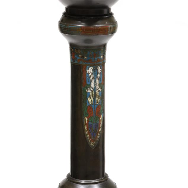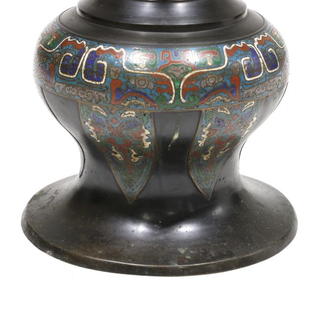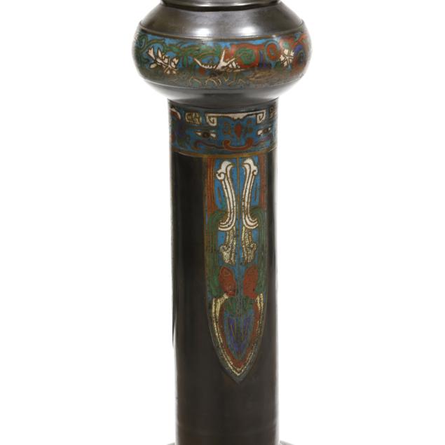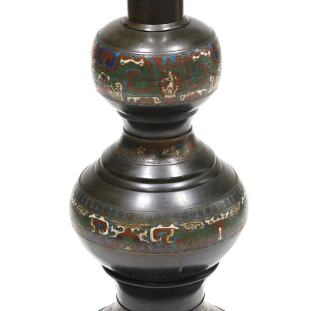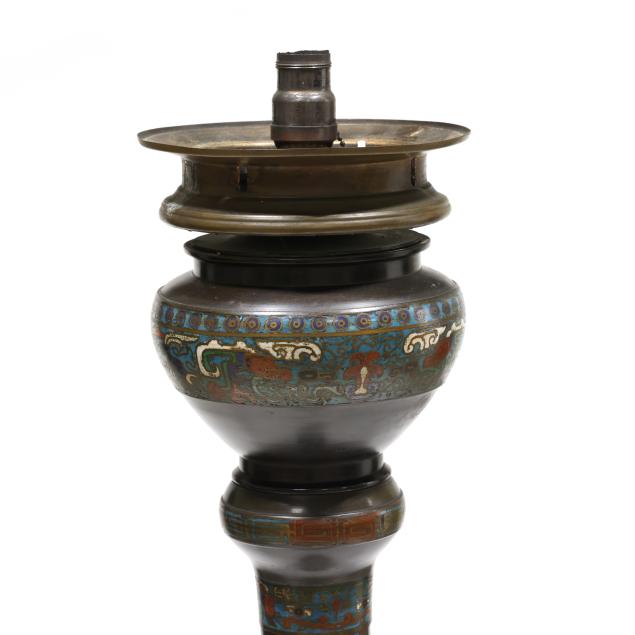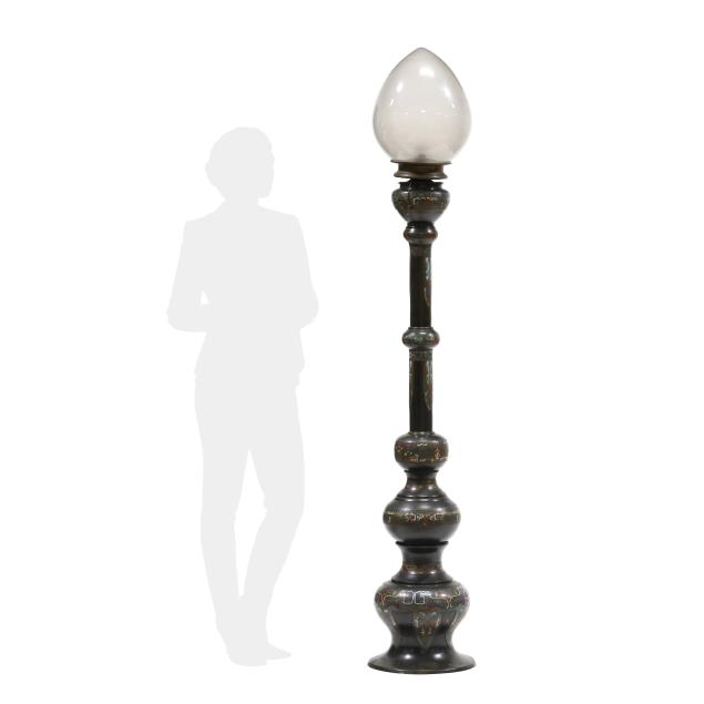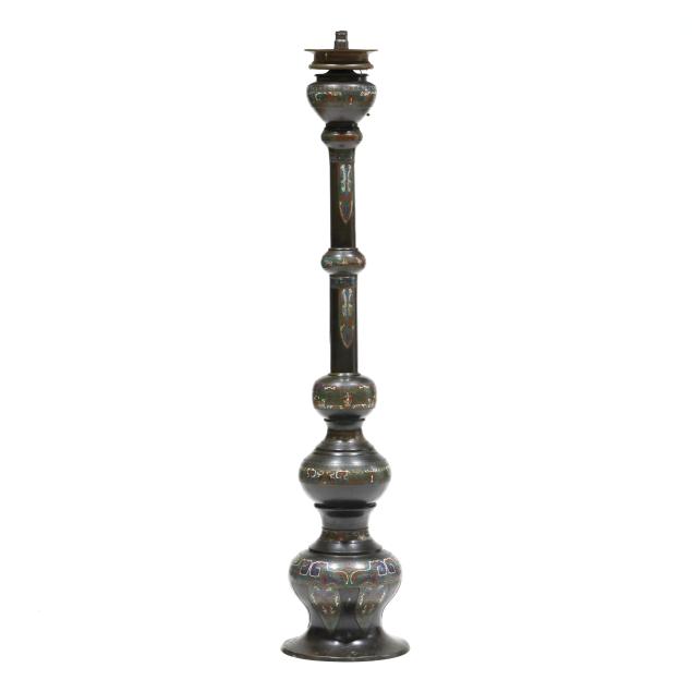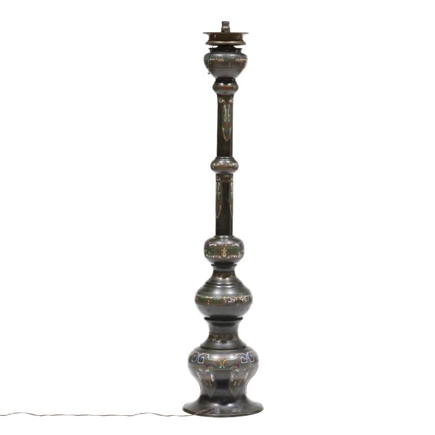 Circa 1900, tiered floor candle holder with sections of cast bronze and colorful chempleve in baluster forms ranging from largest at bottom to smaller towards top until pinnacle which is wide and now fitted with a large bulb from historic old town Alexandria, Virginia, drilled to bottom and base for lamp fitting.