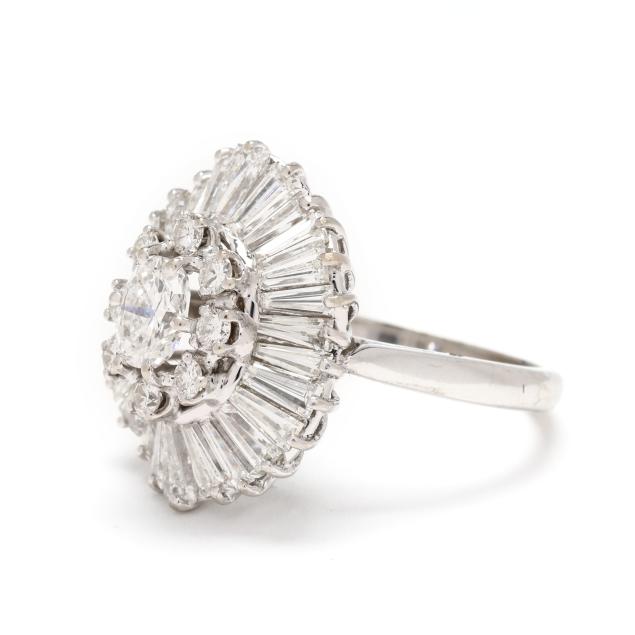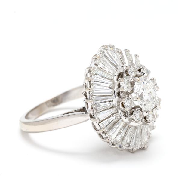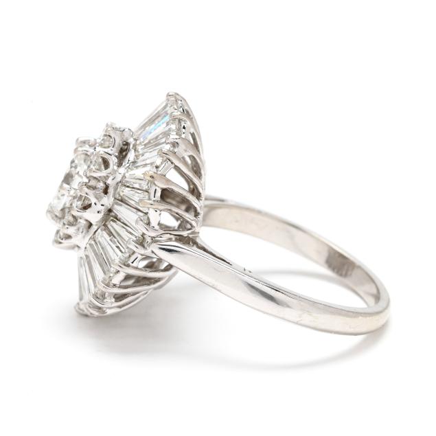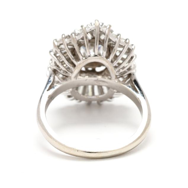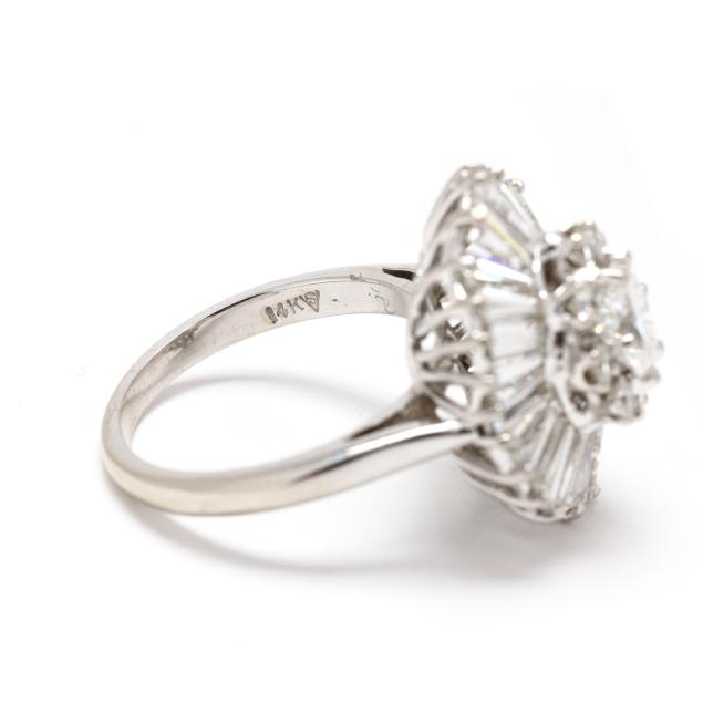 centered on an oval cut diamond (6.1 x 5.3mm) weighing approximately .65 carat (F color, VS1 clarity) surrounded by full cut round and baguette cut diamonds weighing approximately 3.25 total carats (F-G color, VS2-SI1 clarity), in a cathedral setting, stamped 14K and with a maker's mark.