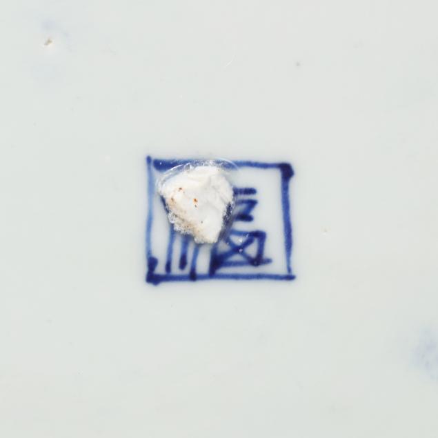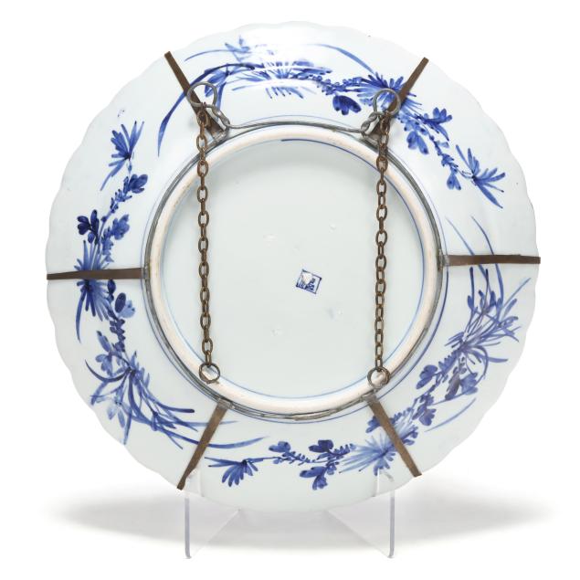 Edo period (1615-1868), 19th century, very large porcelain dish with scalloped rim hand painted in underglaze blue with two large koi fish swimming through water plants surrounded by several smaller fish, the underside with floral garland border to and a fuku mark in blue to center of foot.