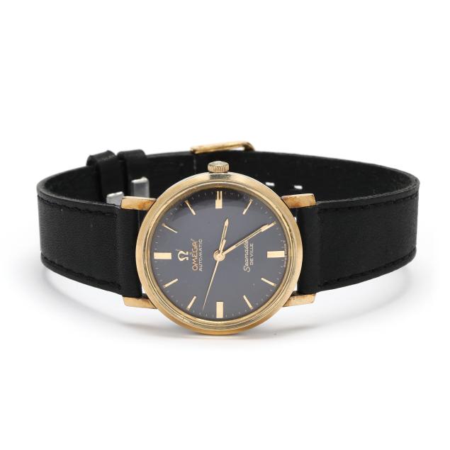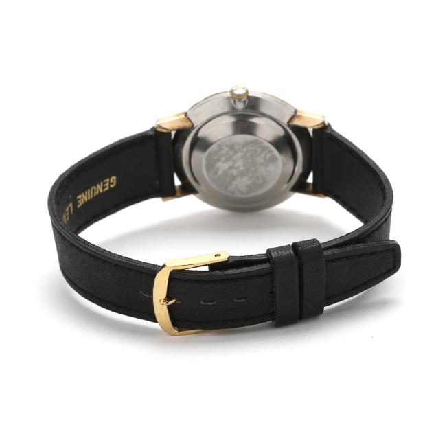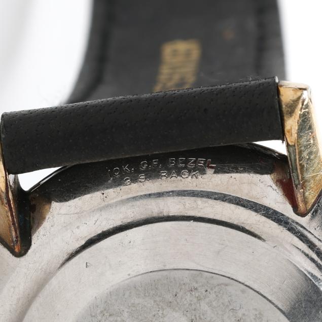 Circa 1972, automatic, the round gold-filled case with polished bezel, the signed black dial with gold baton hour markers and gold sword hands, the black leather strap with gold-tone buckle, the caseback with presentation engraving and stamped 10K.G.F. Bezel / S.S. Back.