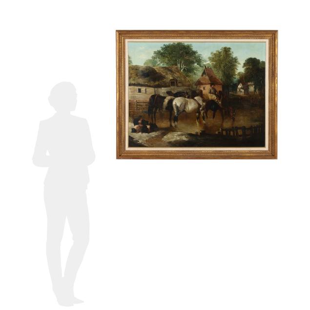 From the Estate of the late Peggy Augustus, Old Keswick, Virginia John Frederick Herring, Jr. was an English painter, son of the celebrated equestrian artist John Frederick Herring, Sr. Growing up in a family of artist, he was immersed early in the world of equestrian and sporting art. While Herring Sr. focused on formal horse portraits and racing imagery, Herring Jr. broadened his scope to include farmyard and pastoral landscapes, often depicting horses, cattle, and other animals in rustic, everyday settings.