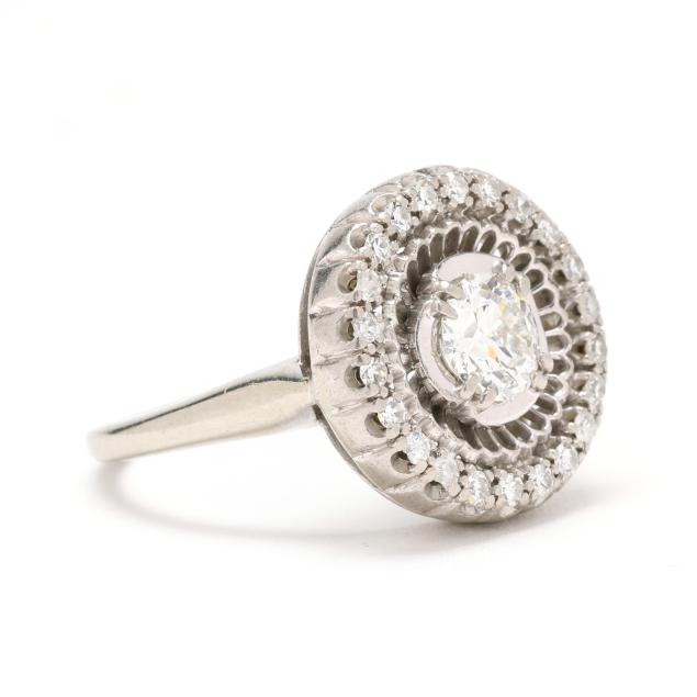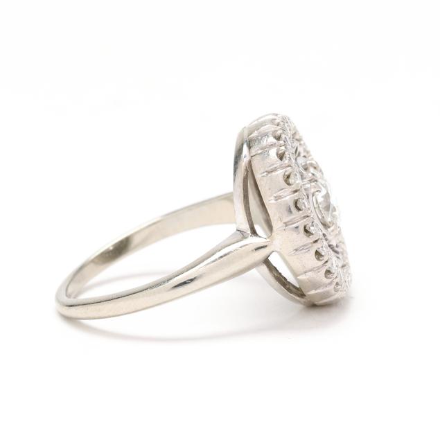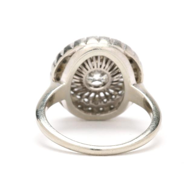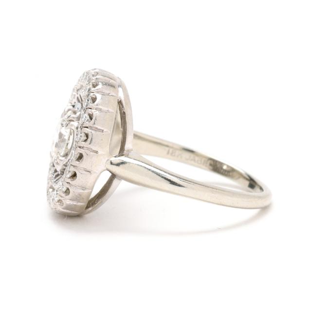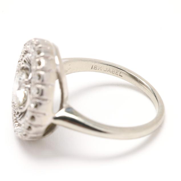 Centered on a old European cut diamond (5.15 - 5.30 x 3.00mm) weighing approximately .50 carat (H color, SI1 clarity) with openwork and single cut diamond surround weighing approximately .22 total carat (H-I color, VS2-SI1 clarity), stamped 18K JABEL.