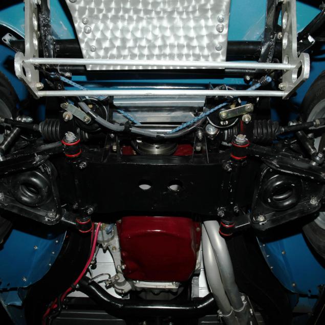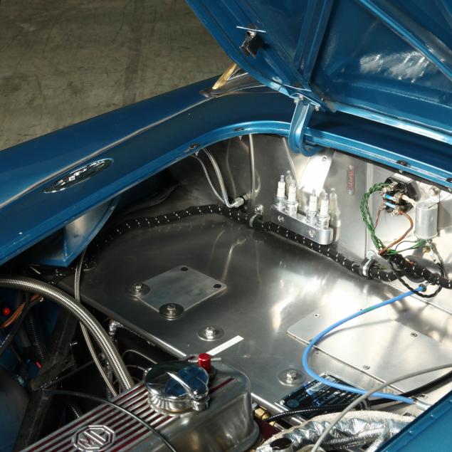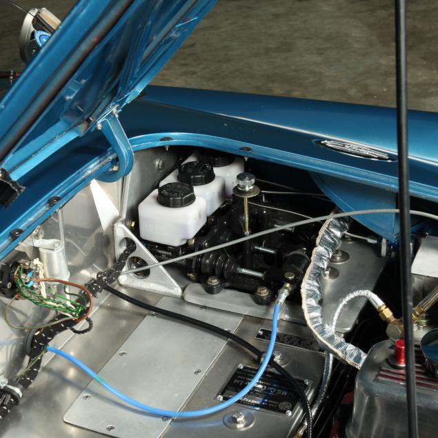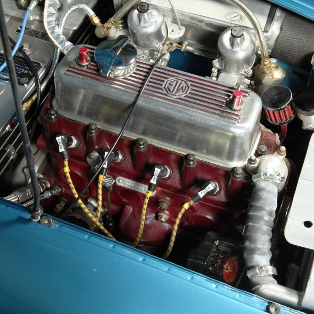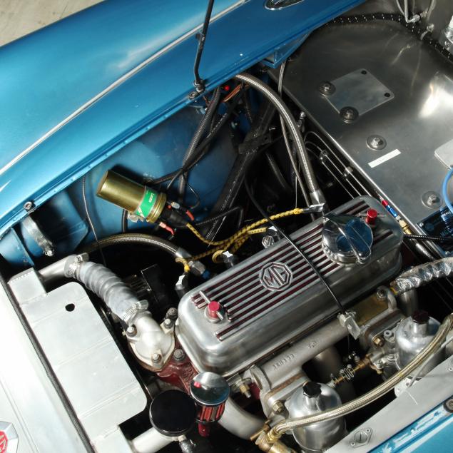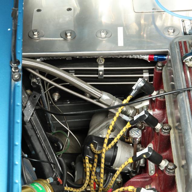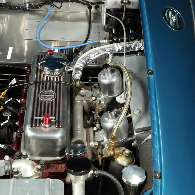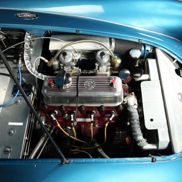 With a 5 main bearing 1798 cc four cylinder engine that was bored 0.040 over during the rebuild. A five-speed Ford transmission was installed, as well as Wilwood disc brakes, master cylinder, and stainless steel lines on all four corners. The brake bias is controlled in cockpit. An aluminum flywheel and backing plate was used. An aluminum radiator and oil cooler was installed along with an electric fan override. Custom headers were fabricated, and a stainless steel exhaust installed. A pair of 1.75" racing SU carburetors were installed, and a new wiring harness by British Wiring.