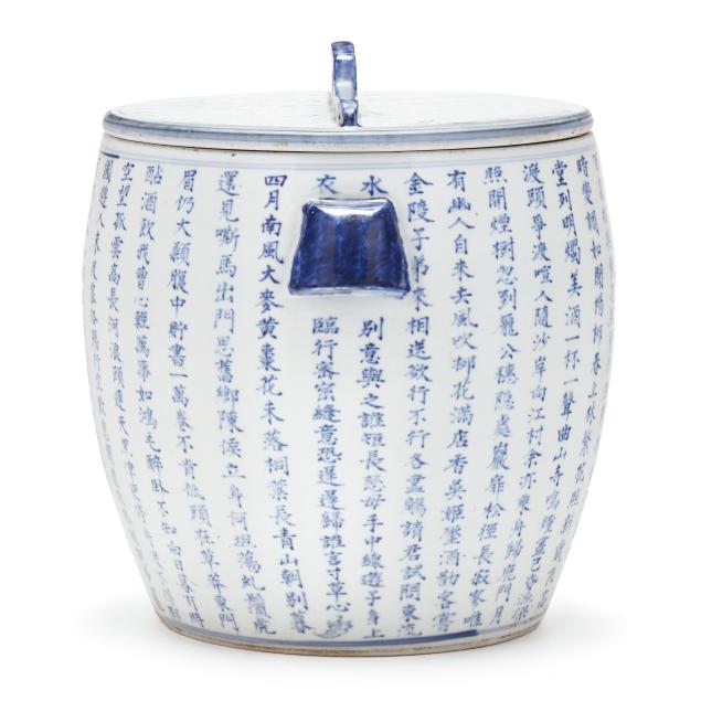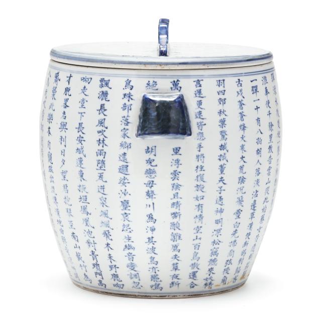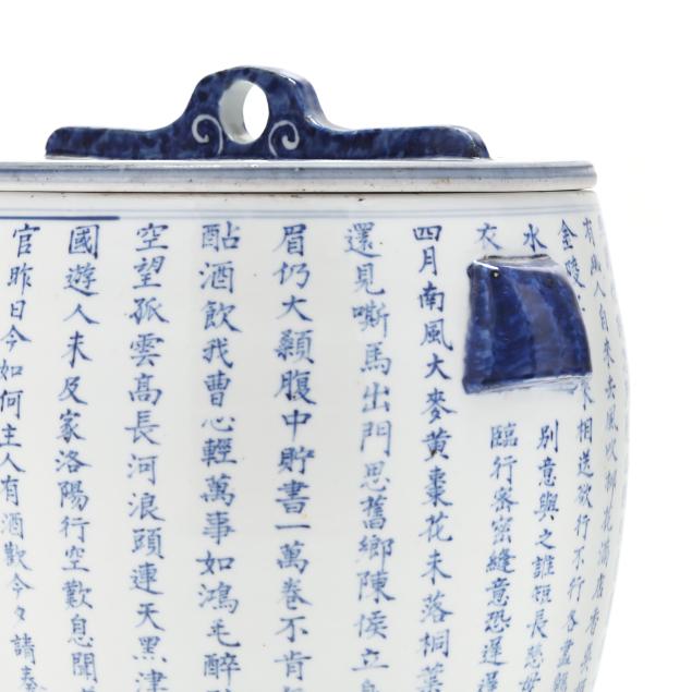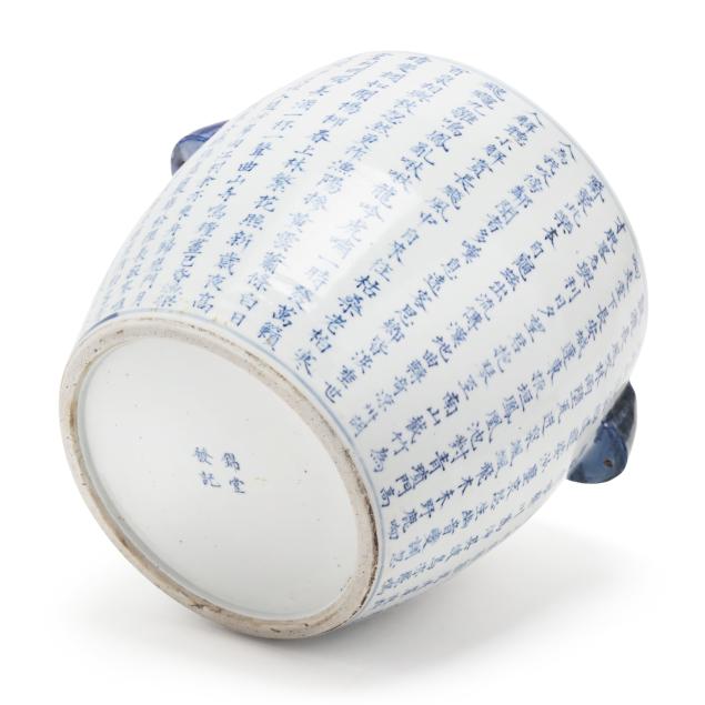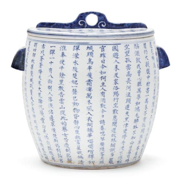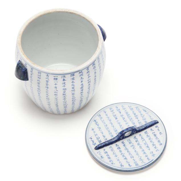 Qing dynasty (1644-1912), 19th century, a porcelain jar with flat cover hand painted in underglaze blue with Chinese calligraphy, with a handle to top of cover together with small handles flanking the upper body of jar in blue, with four character mark