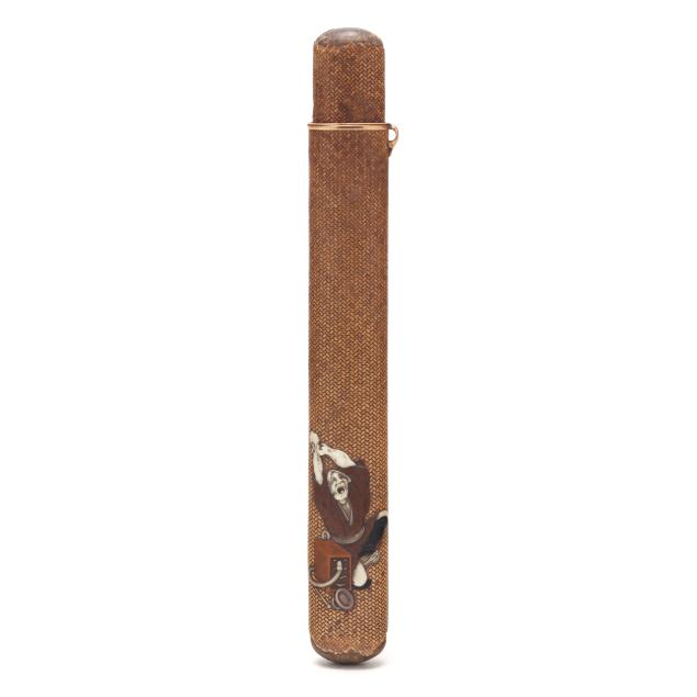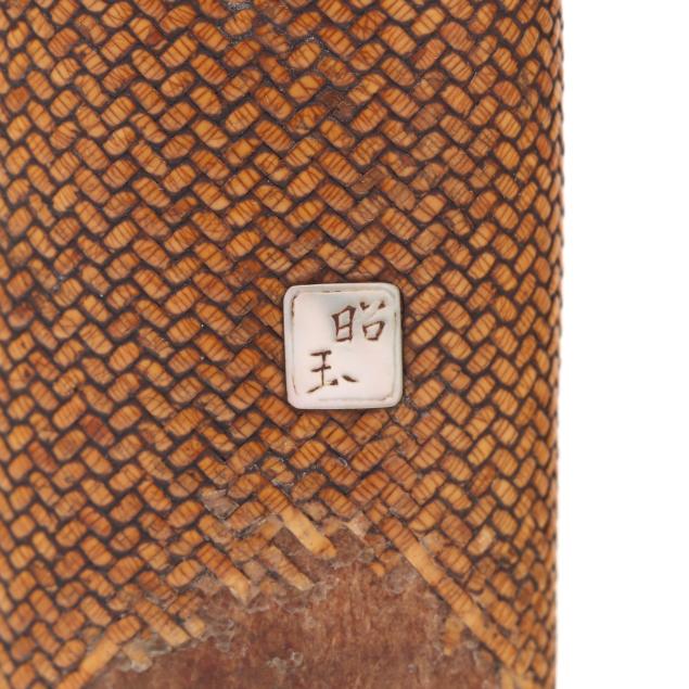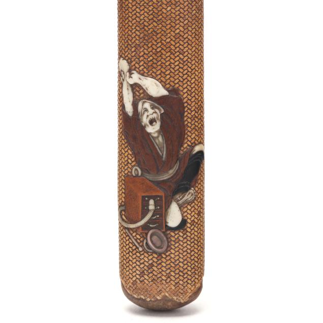 musozutsu form pipe case, woven rattan applied with ivory and stained boxwood, decorated in great detail with a older male figure seated with a traveling box and his arms raised up towards the sky, signed with inlaid seal 昭玉 (Shogyoku).