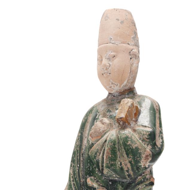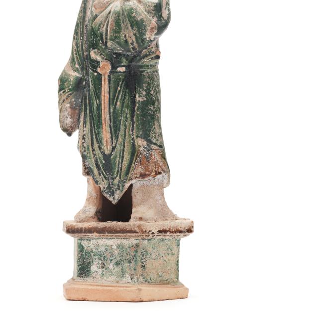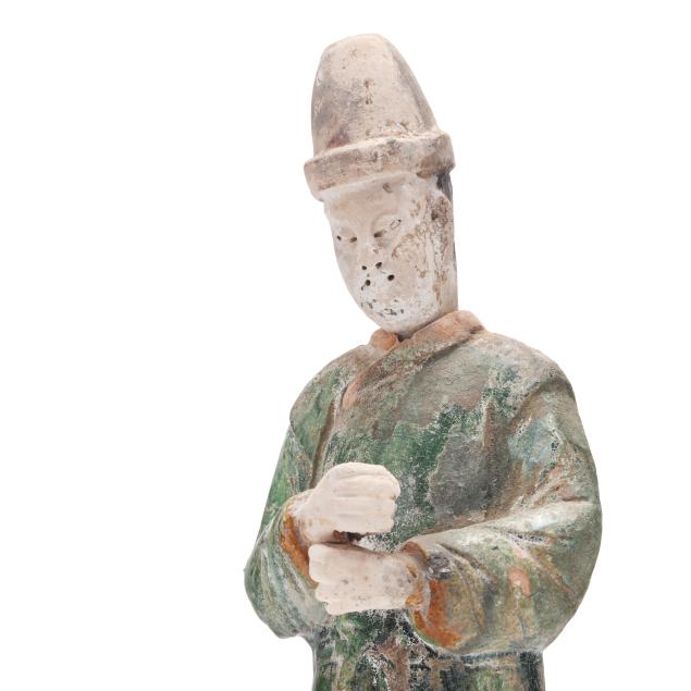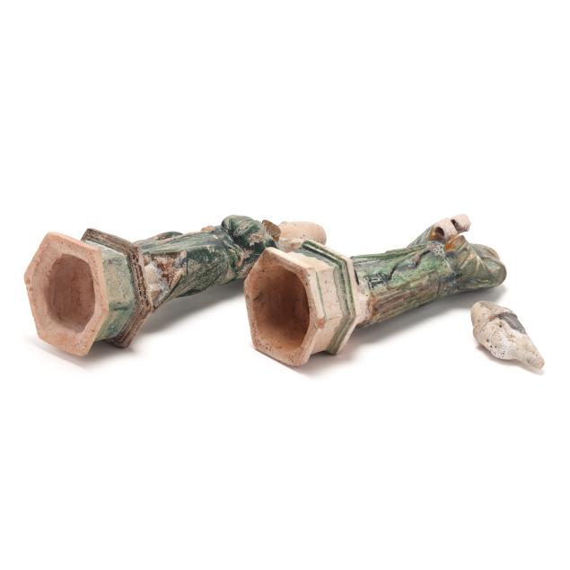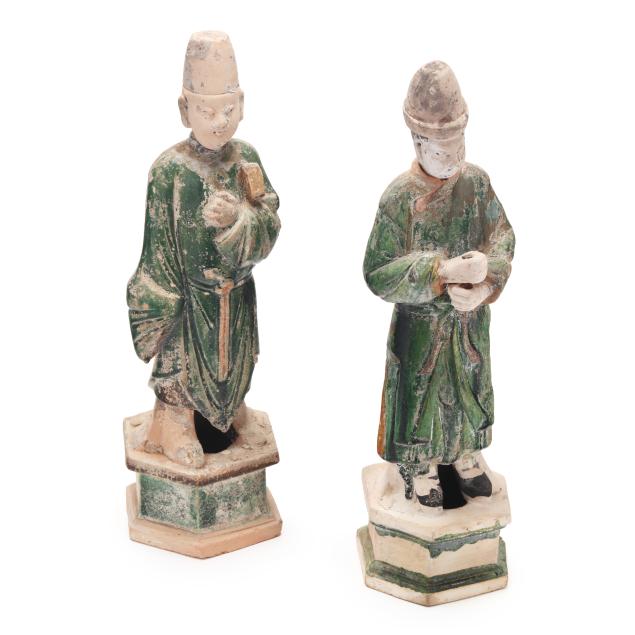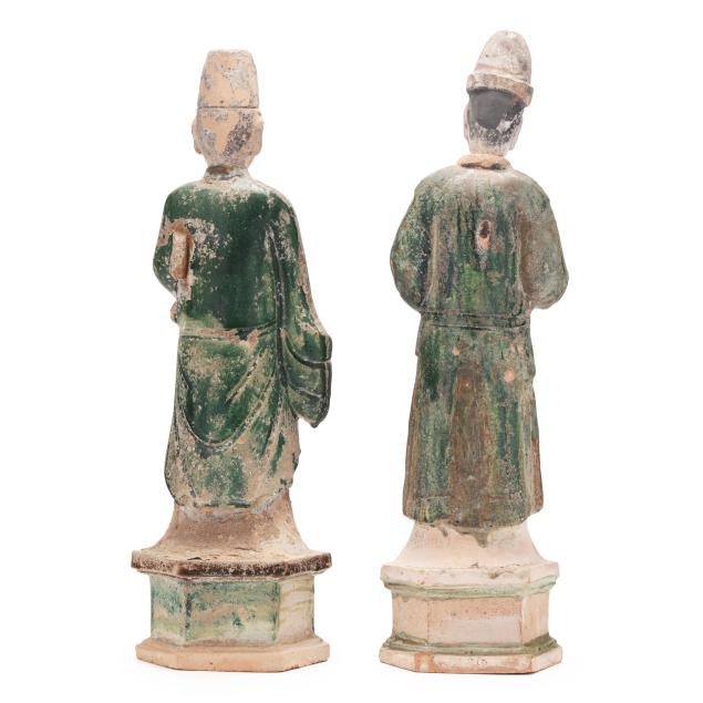 From the Estate of the late Susan C. Frankenberg, Hillsborough, North Carolina Break and repair to head and neck of one figure; the other no longer holding staff and with firing hairline to top of base, a few small chips to neck; both with consistent paint loss and surface abrasions.