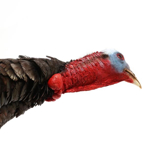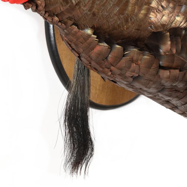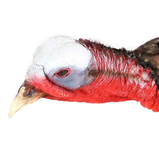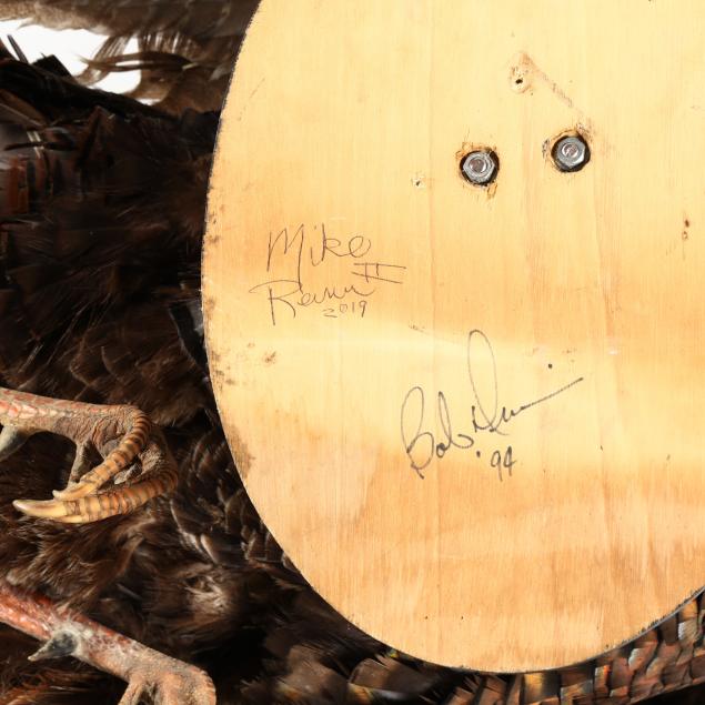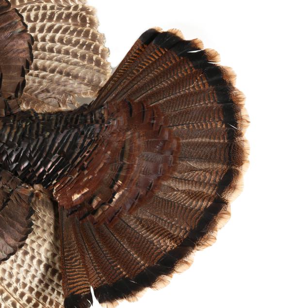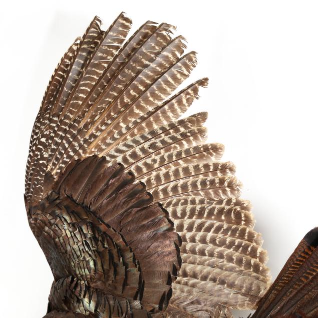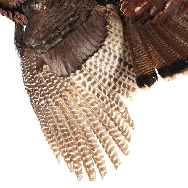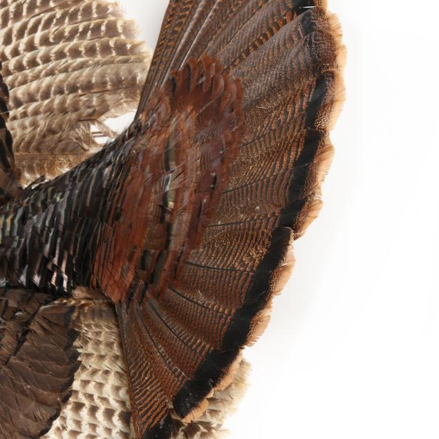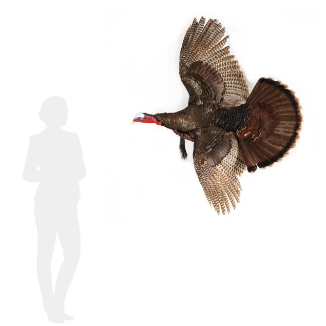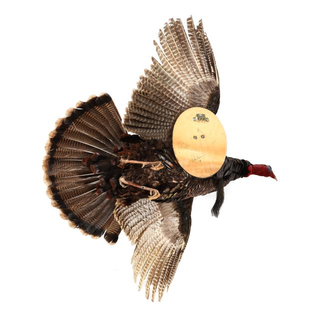 Measures 46 in. from tip of beak to end of tail feathers, 58 in. wingspan, 8 in. beard, mounted to wooden wall mount base in a flying position.