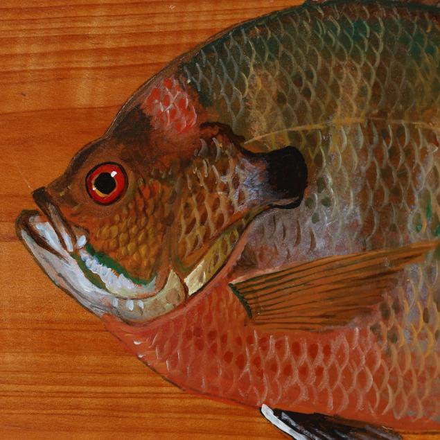 Garner, North Carolina, hand painted redbreast sunfish on pinewood paddle, signed D. RAVER on bottom right paddle blade.