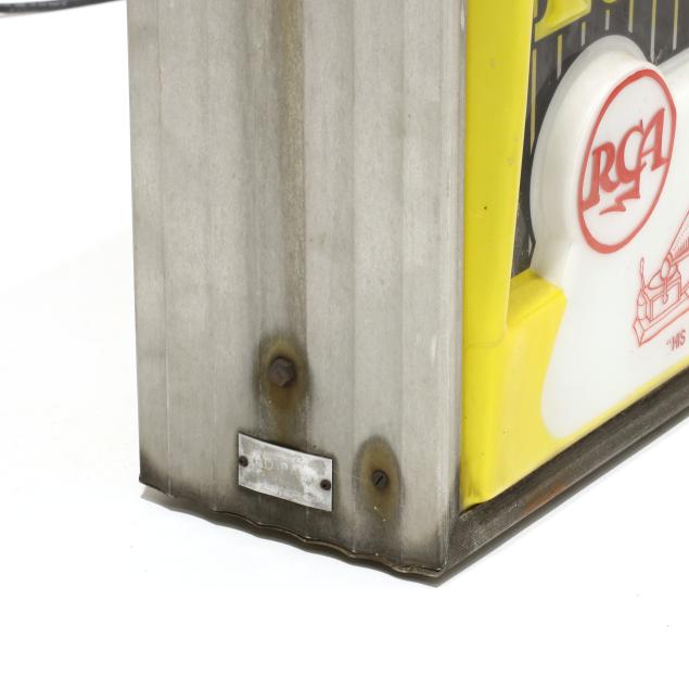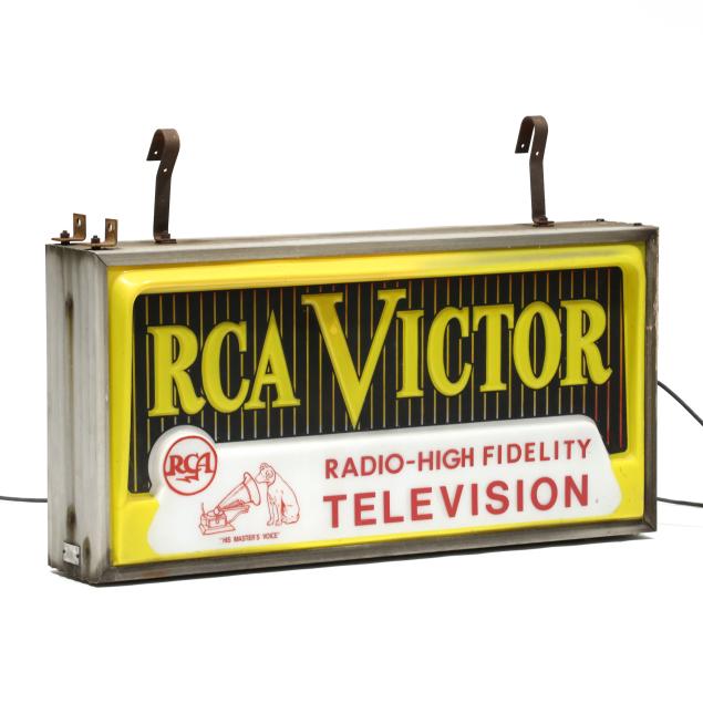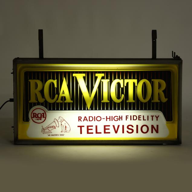 Mid-century, metal and plastic, electrified rectangular hanging dealer sign, advertising "RCA VICTOR" in bold yellow and black design, above red and white "RCA / RADIO-HIGH FIDELITY / TELEVISION" with illustration of Nipper near a victrola and "HIS MASTER'S VOICE" on both sides.