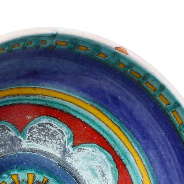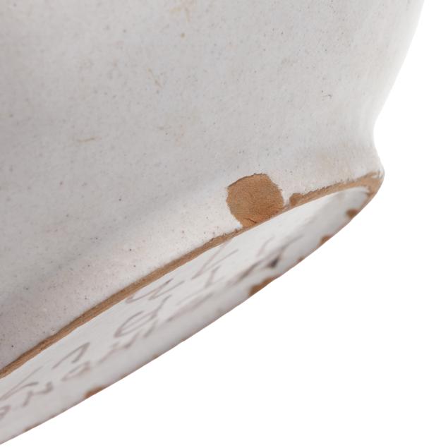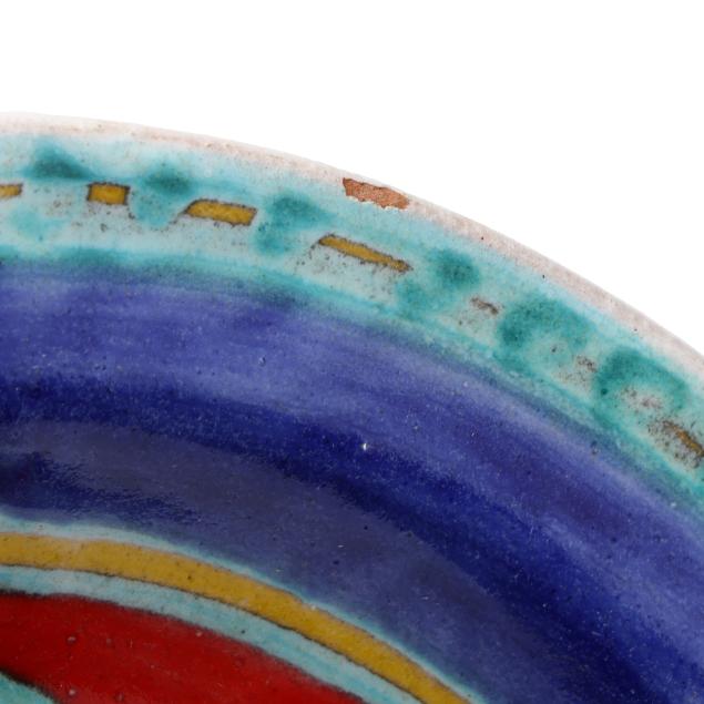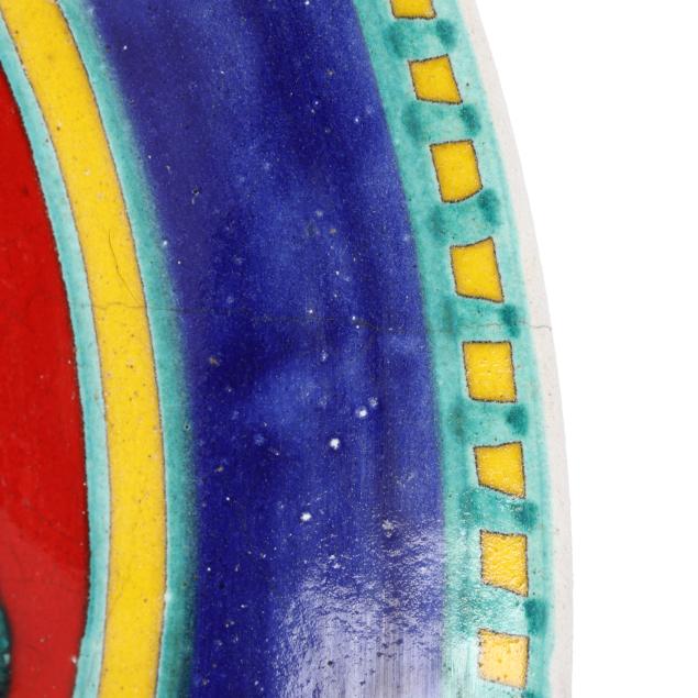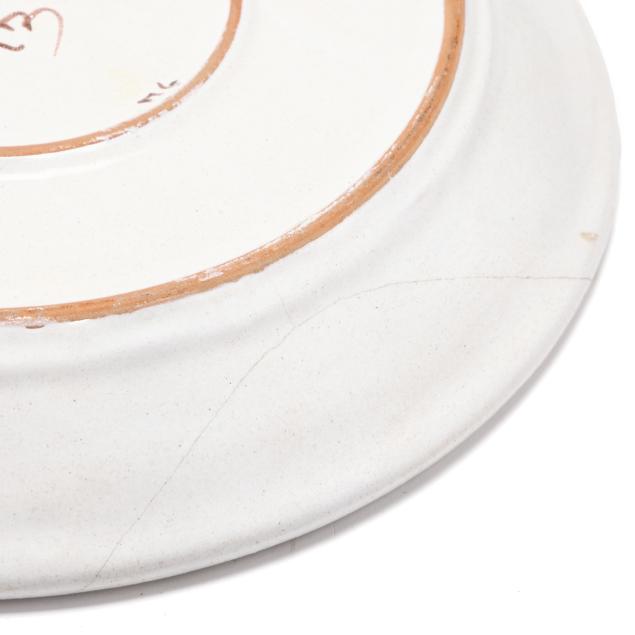 From the Estate of the late Peggy Augustus, Old Keswick, Virginia Scattered glaze skips to most; glaze and firing anomalies as made; chip to rim of circular platter; small chip to rim of one charger; small chip to rim of one dinner plate; hairline to rim of one low bowl; chip to underside of one large footed bowl; firing chip to underside of one medium footed bowl; small chip to rim of one small footed bowl.